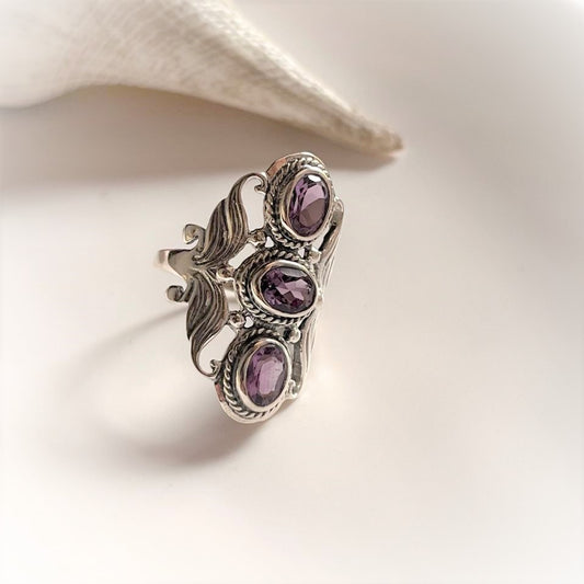 Amethyst 3 Stone Statement 925 Sterling Silver Ring