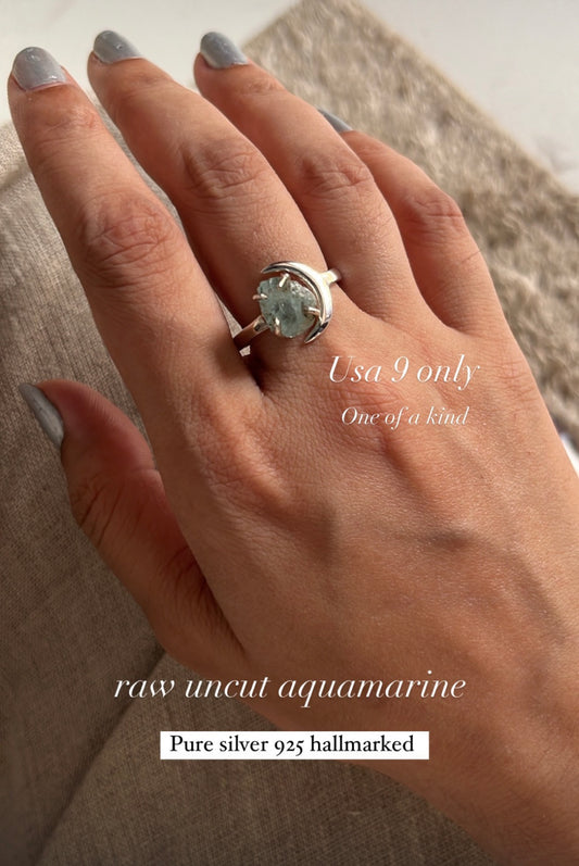 Aquamarine Raw Uncut Crescent Moon Adjustable 925 Sterling Silver Ring