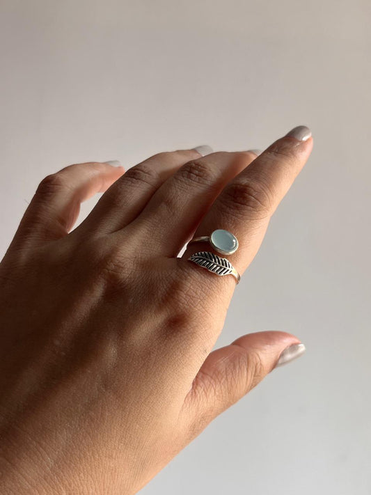 Aqua Chalcedony Feather Adjustable 925 Sterling Silver Ring