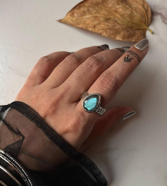 Natural Labradorite Rustic Pear Hammered Band 925 Sterling Silver Ring