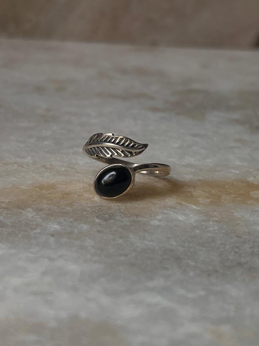 Black Onyx Feather Adjustable 925 Sterling Silver Ring