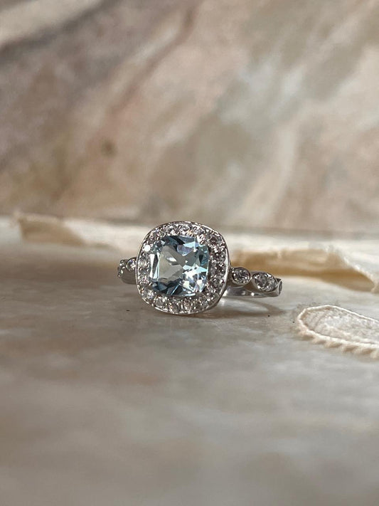 Blue Topaz & White Topaz Cushion Cut Vintage Solitaire 925 Sterling Silver Ring
