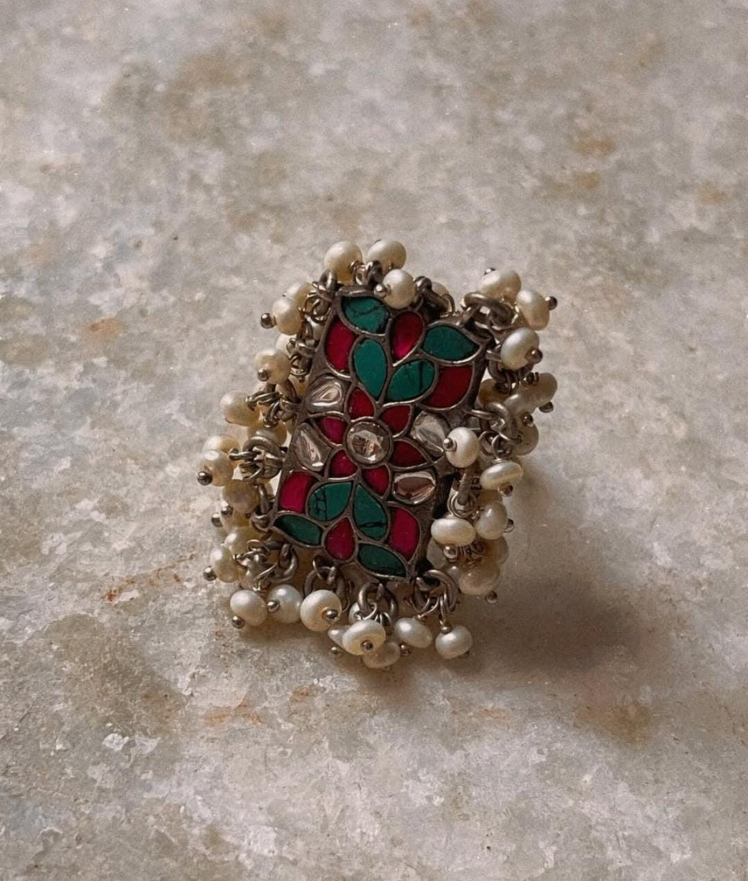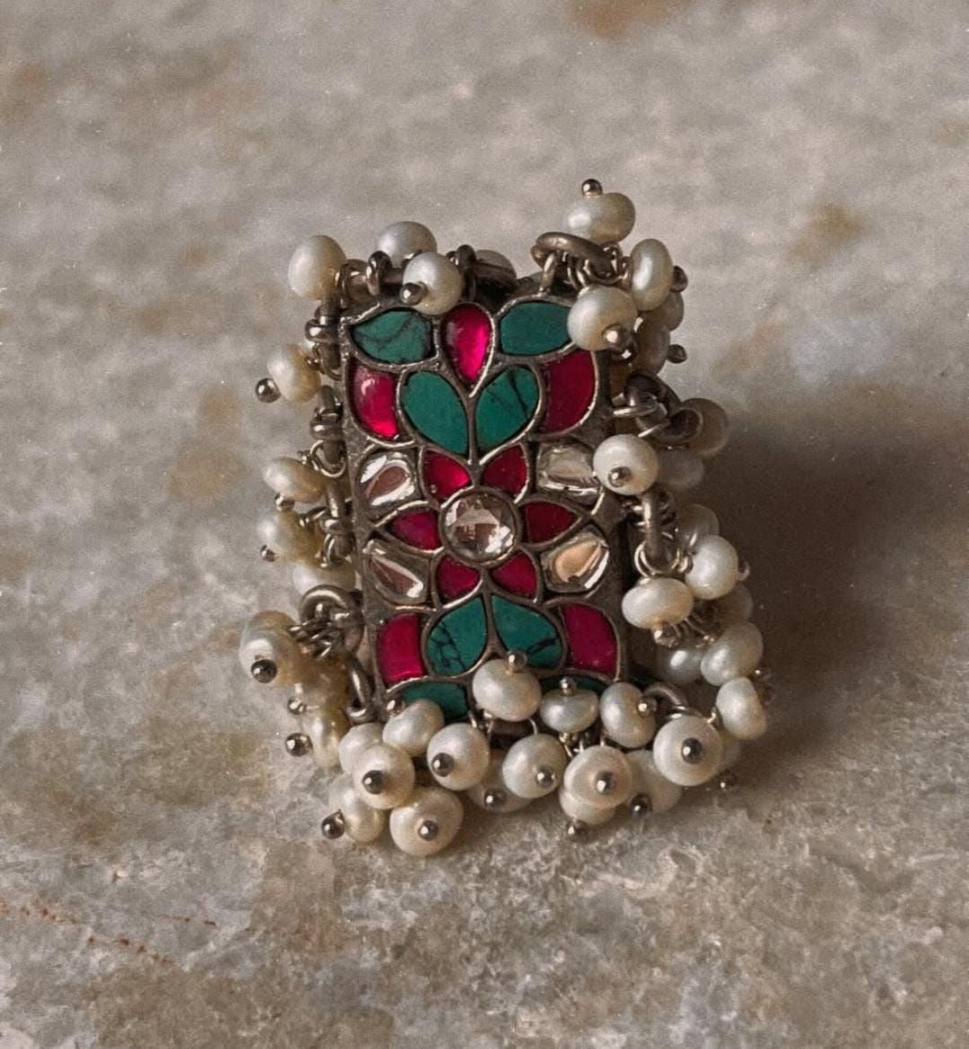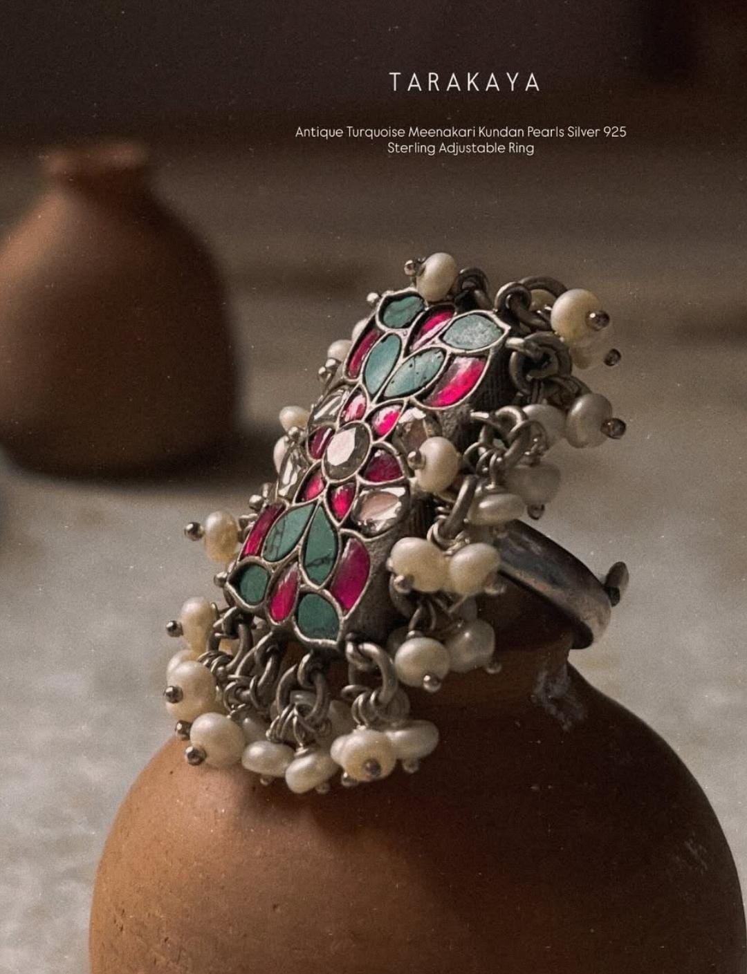 Antique Turquoise Meenakari Kundan Fresh Water Pearls Handcrafted Silver 925 Sterling Adjustable Ring