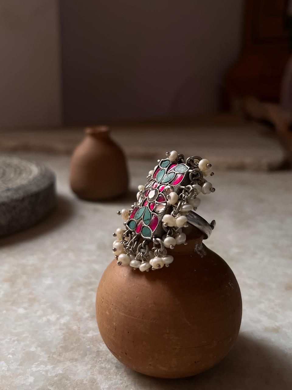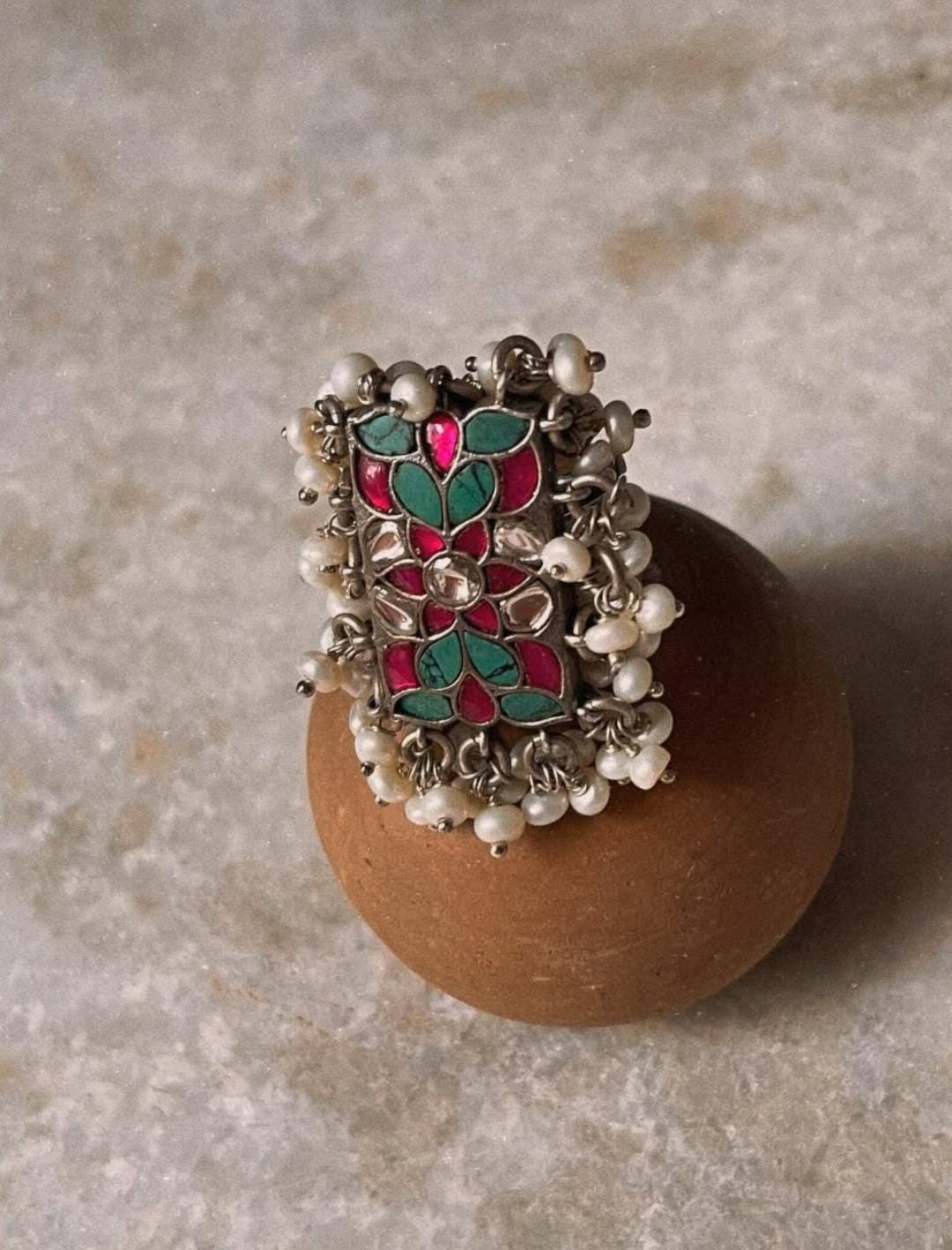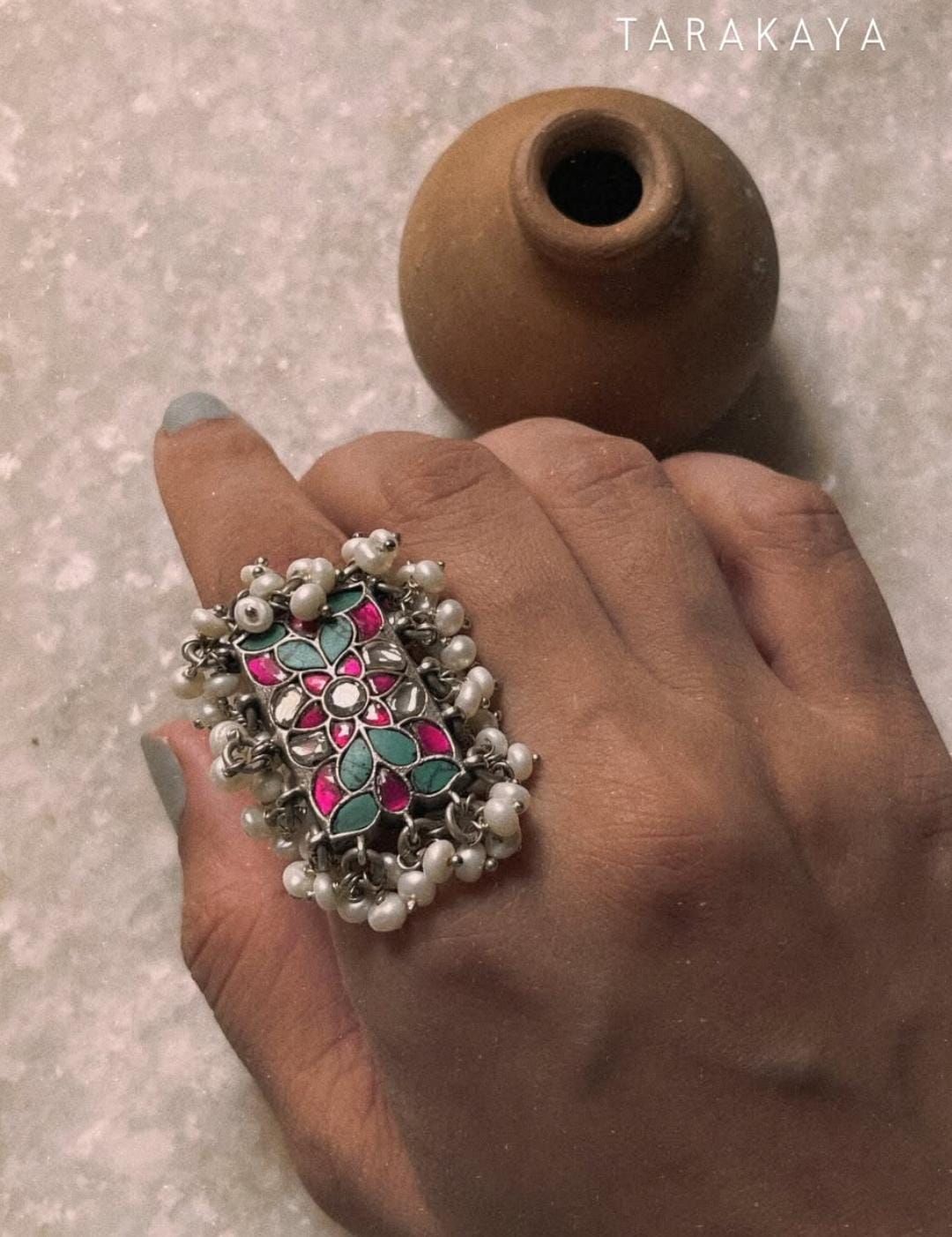 Antique Turquoise Meenakari Kundan Fresh Water Pearls Handcrafted Silver 925 Sterling Adjustable Ring