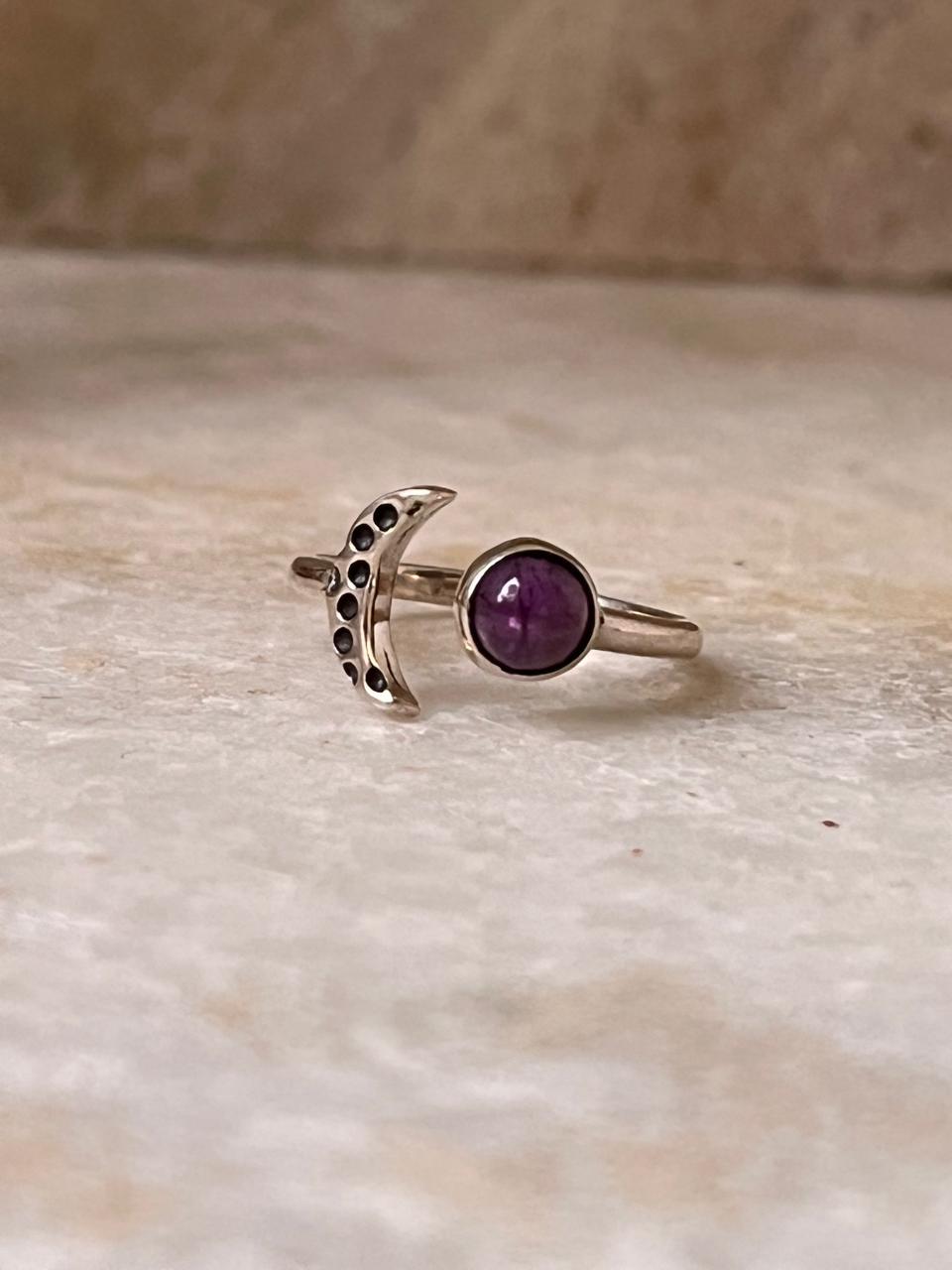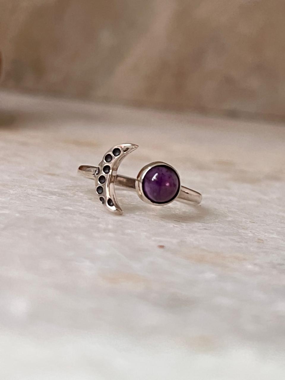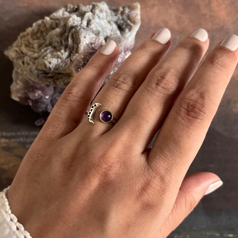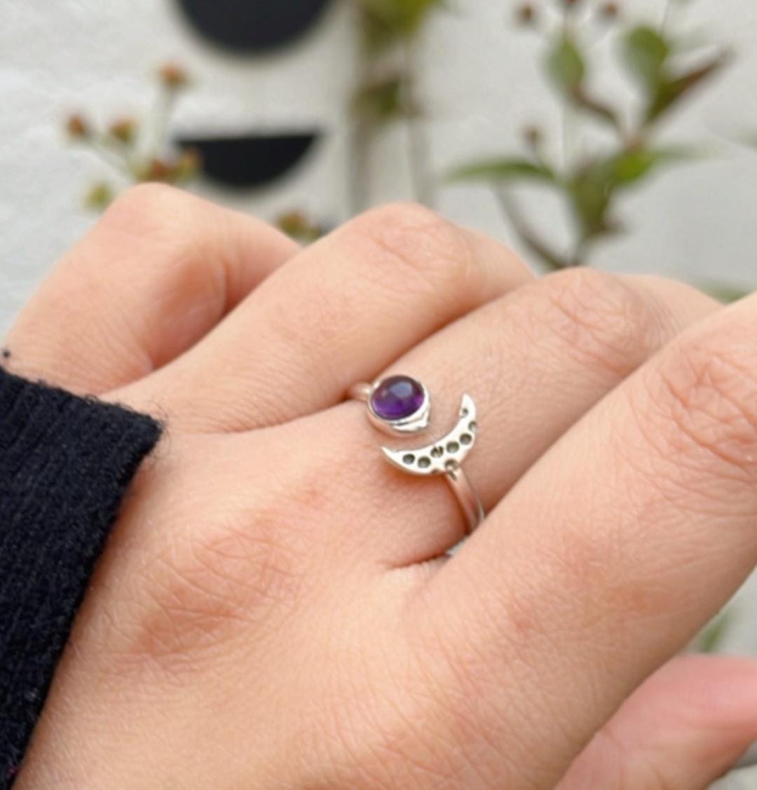 Amethyst Crescent Moon Adjustable 925 Sterling Silver Ring