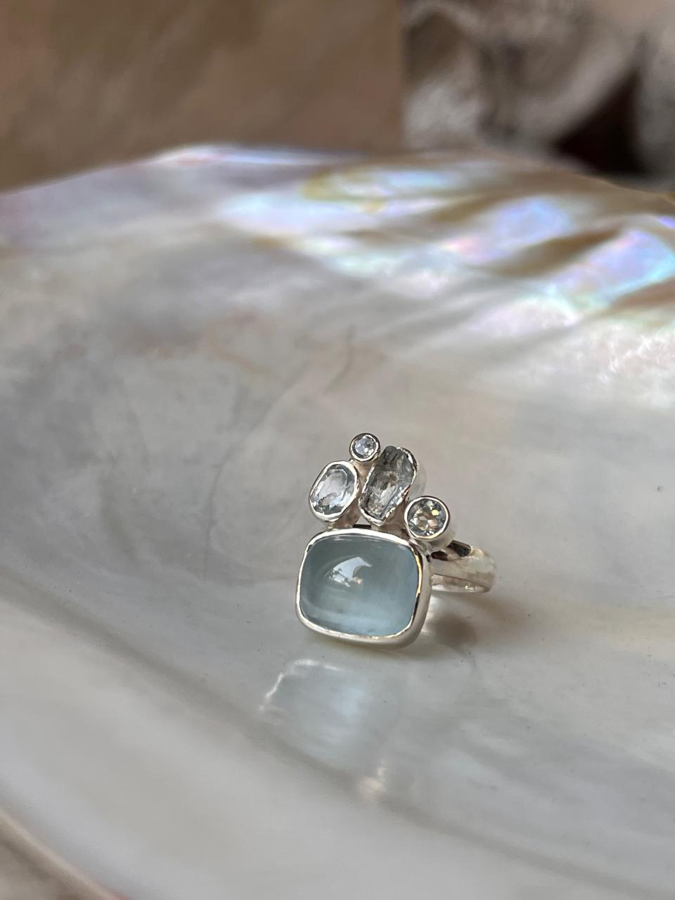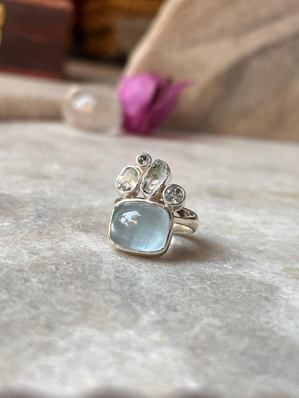 The Aquamarine & Blue Topaz Cluster 1 925 Sterling Silver Ring is a beautiful, refreshing piece that exudes serenity and clarity. Aquamarine, with its cool, oceanic hue, symbolizes calmness and courage, while blue topaz promotes clear communication and self-expression. Set in high-quality 925 sterling silver, this ring is not only a stunning accessory but also a source of soothing energy and balance for daily wear.