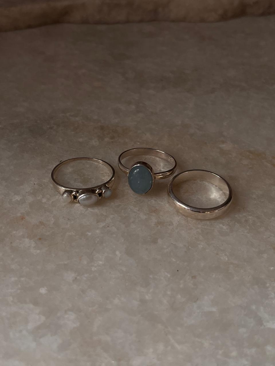 Aquamarine Natural Oval, Fresh Water Pearl 3 Stone & Plain 4mm Band 925 Sterling Silver Stack Set Ring