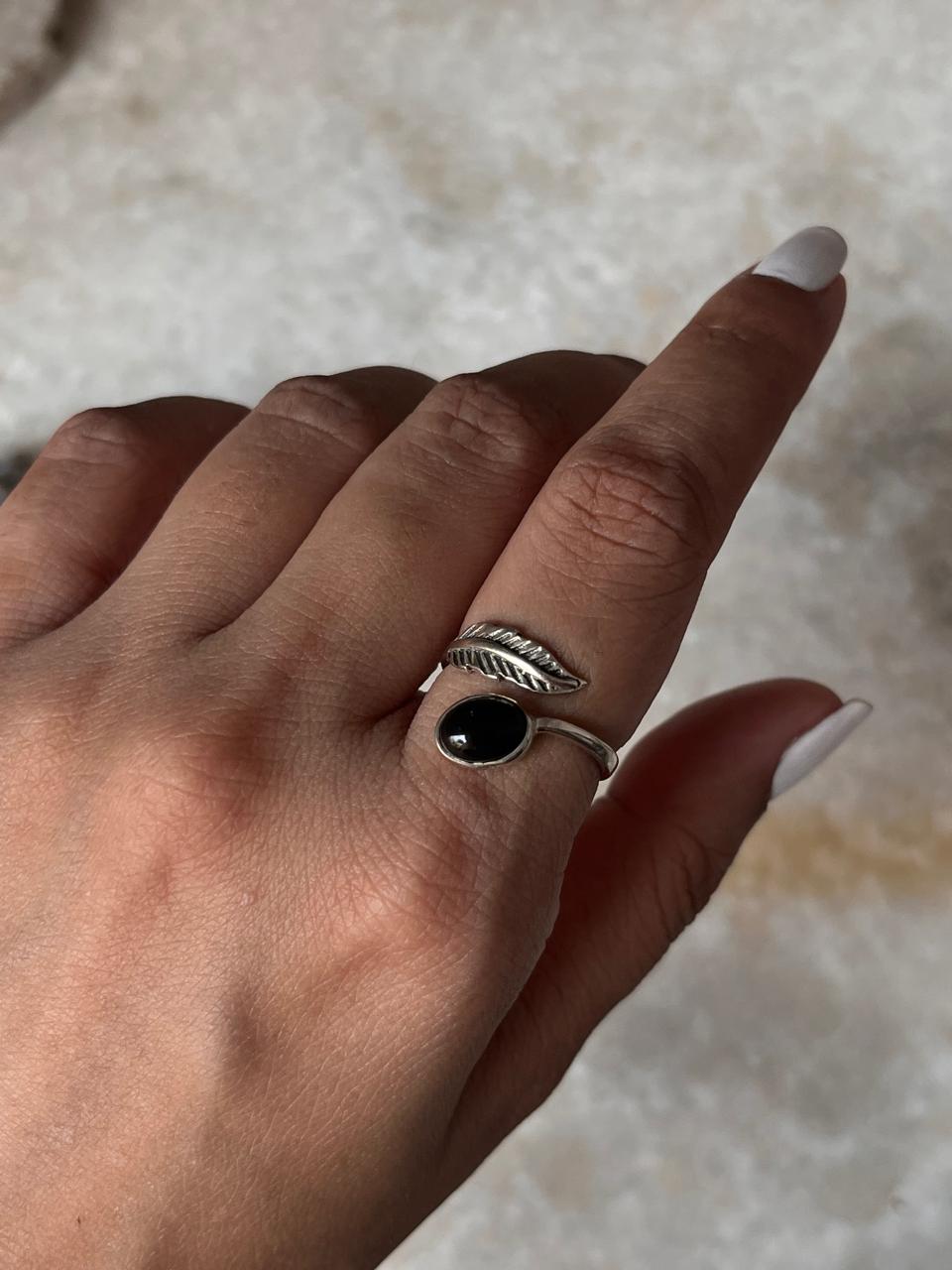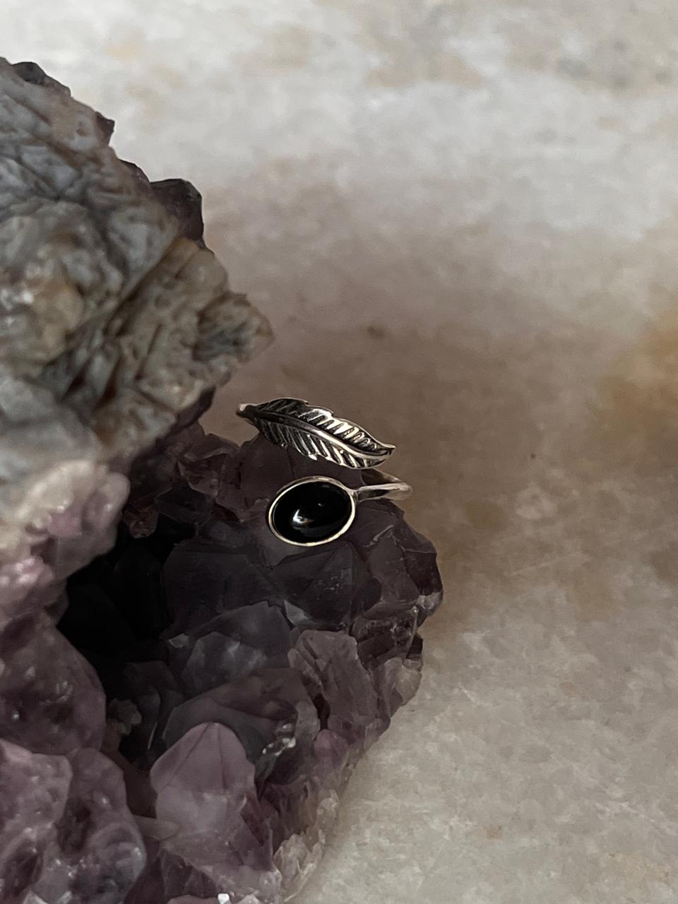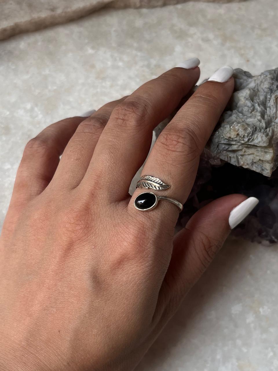 Black Onyx Feather Adjustable 925 Sterling Silver Ring
