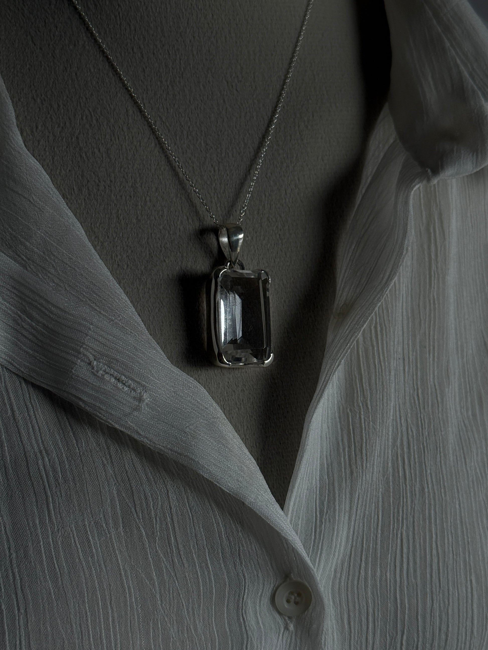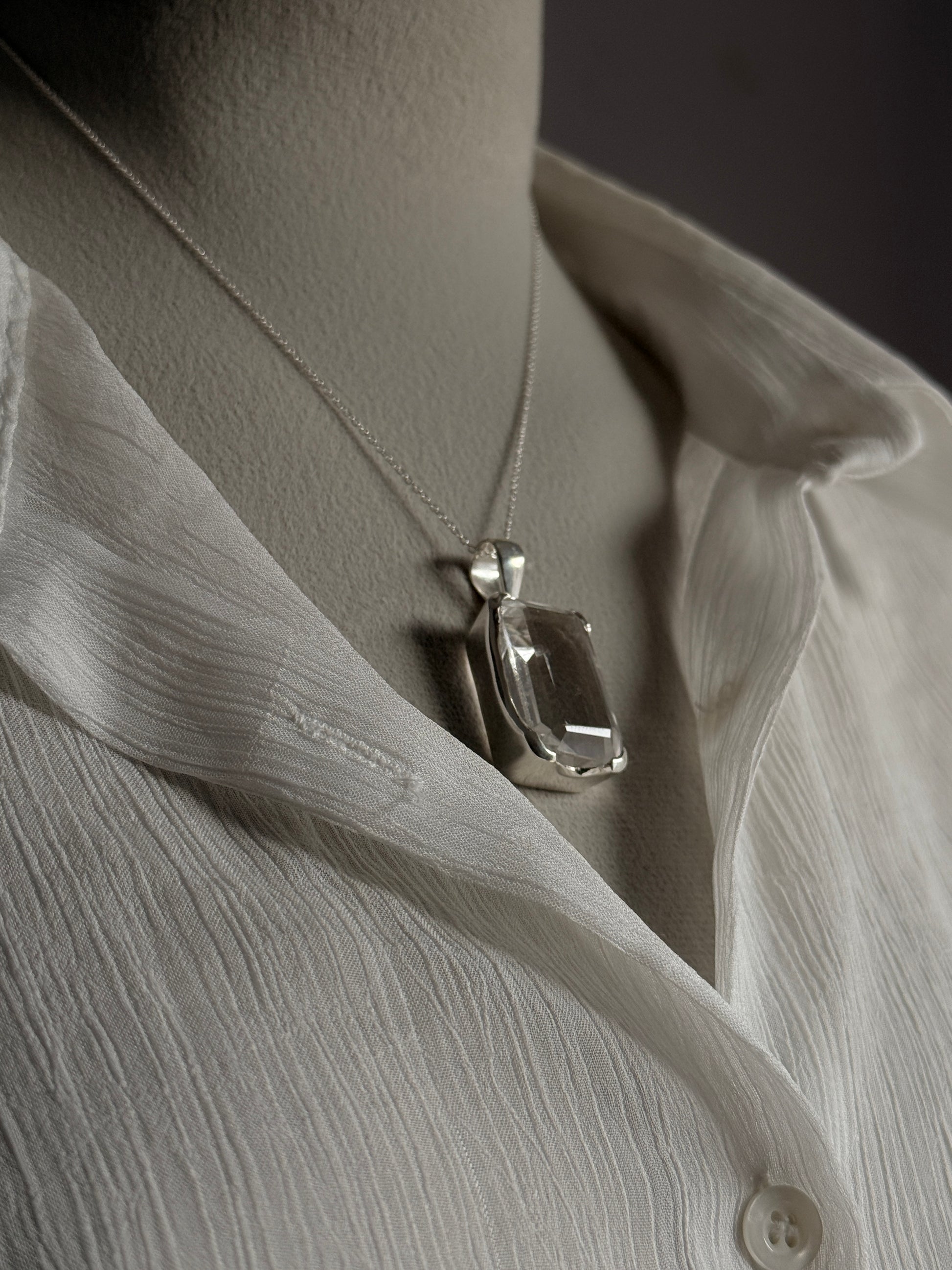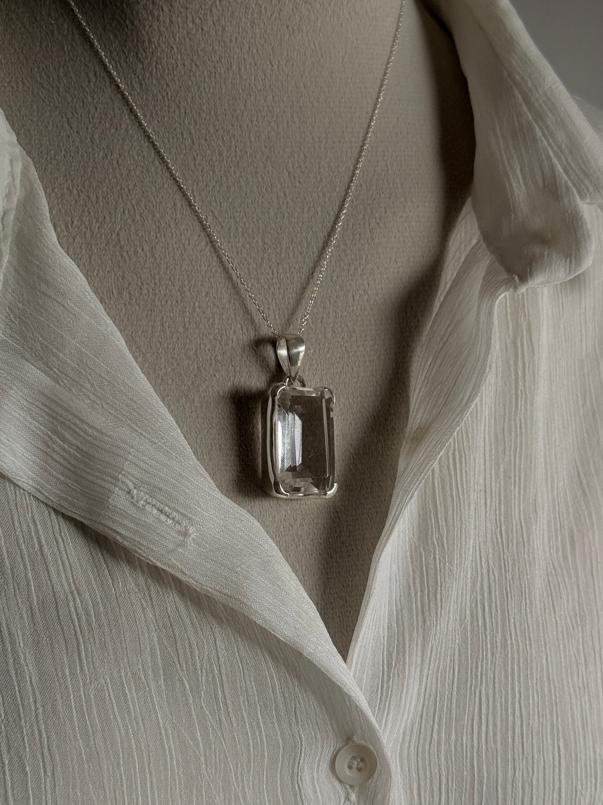 Clear Quartz Rectangular Big Statement Handcrafted 925 Sterling Silver Pendant