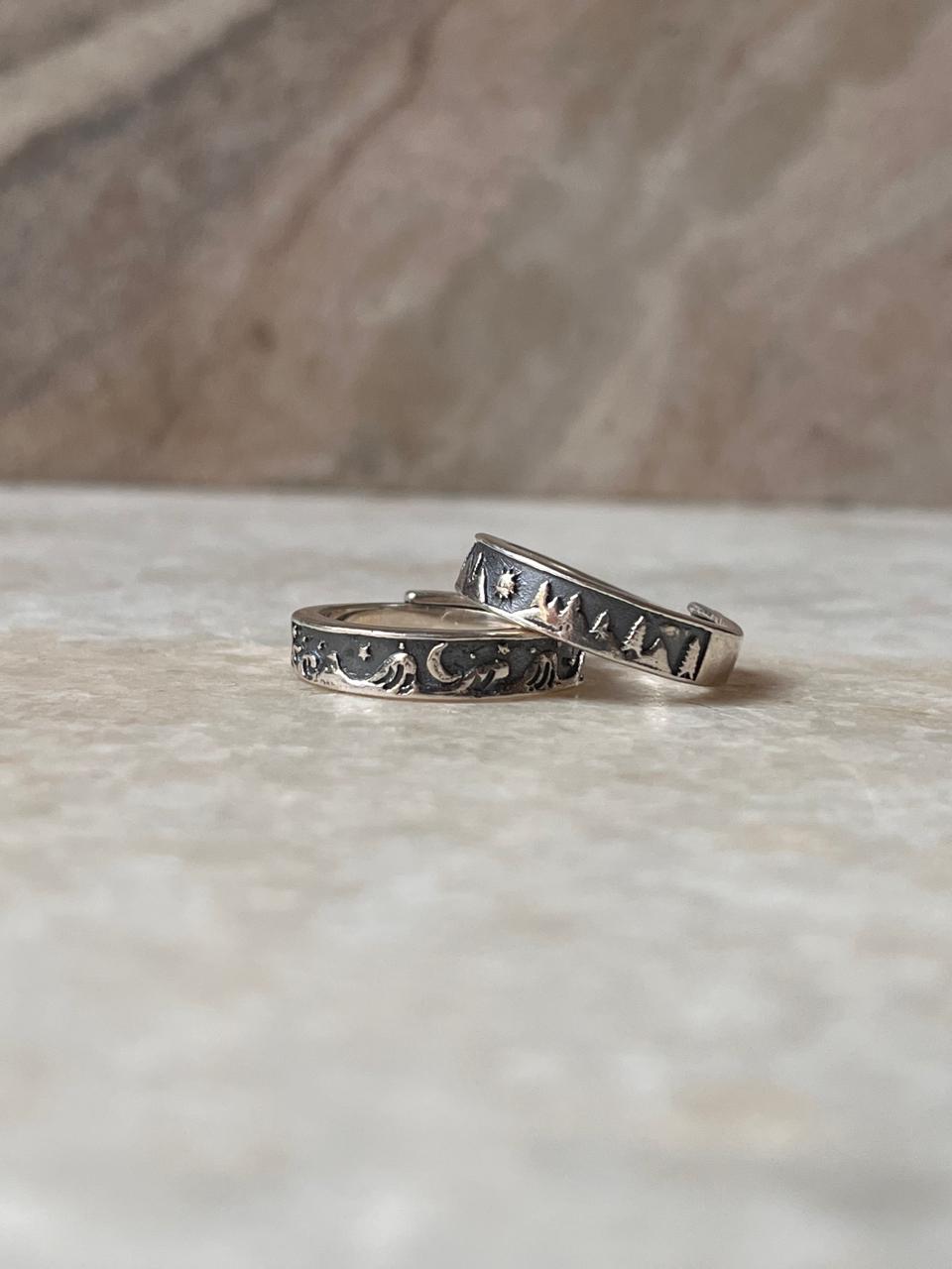 This Couple Adjustable Silver Ring features intricate designs of calming waves, a serene moon and stars, and a majestic mountain with a pine tree and sun. Made of high-quality silver, this ring is also adjustable for the perfect fit. Express your love and connection through nature with this unique and elegant ring.-Pure silver 925 hallmarked