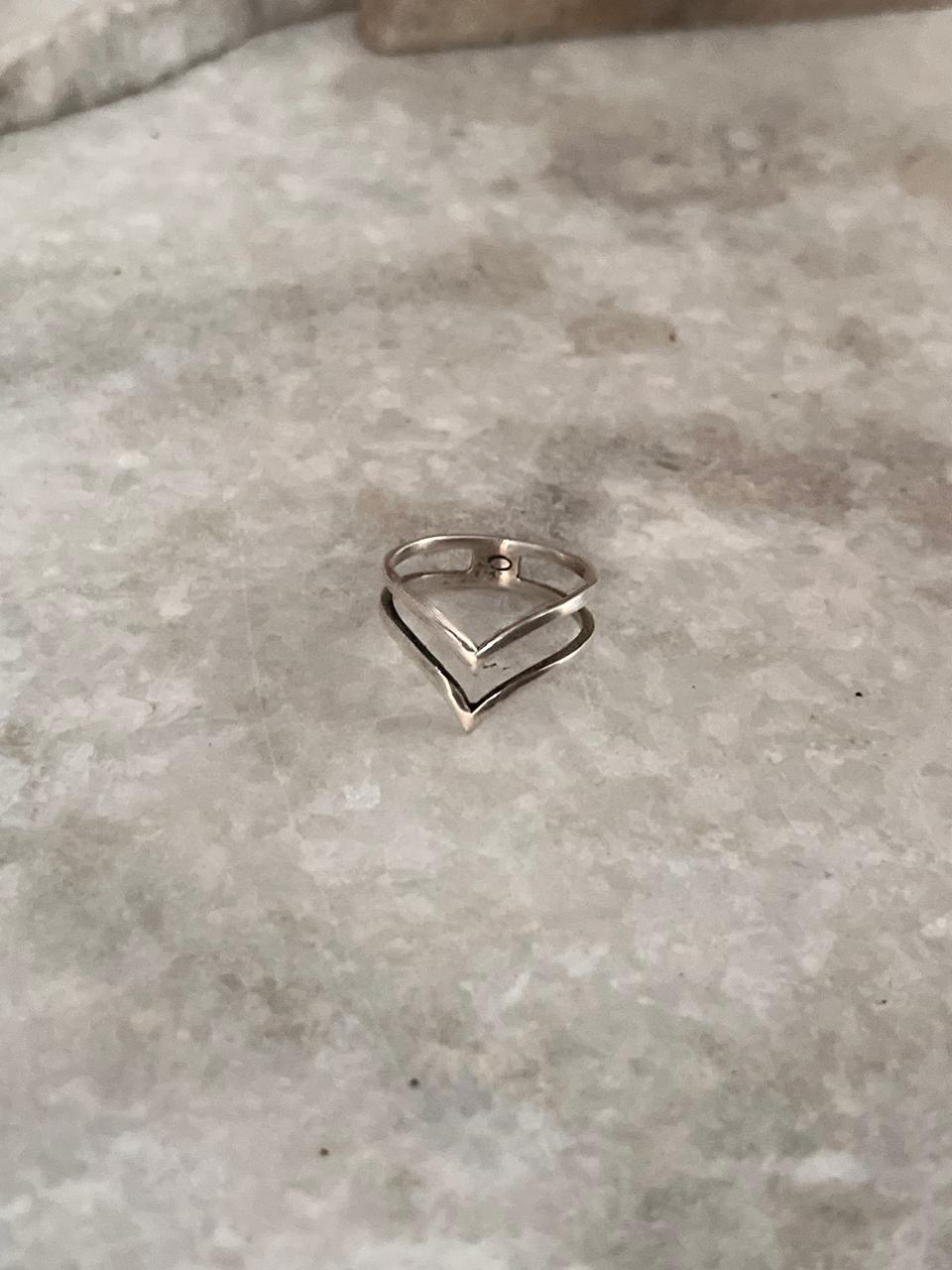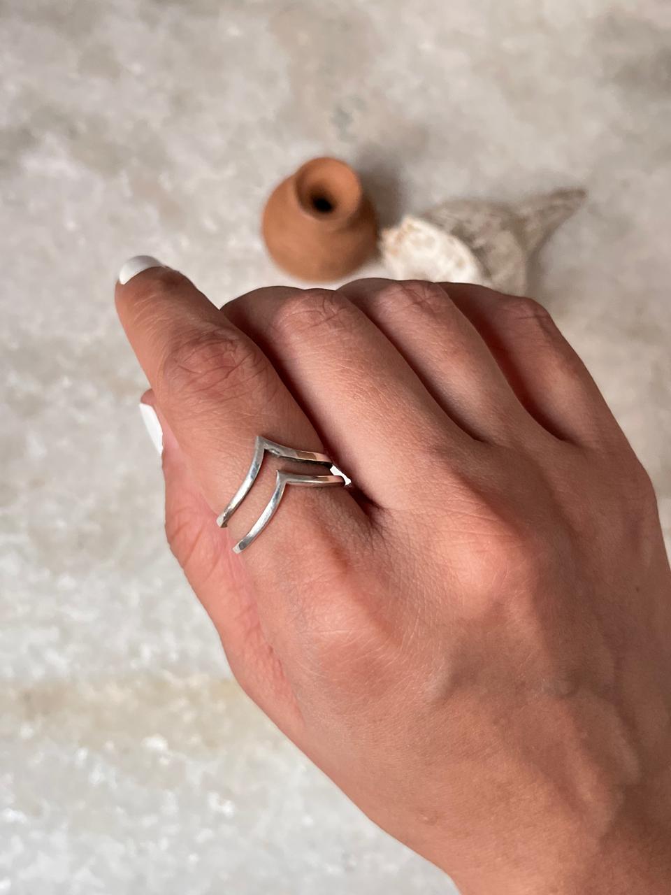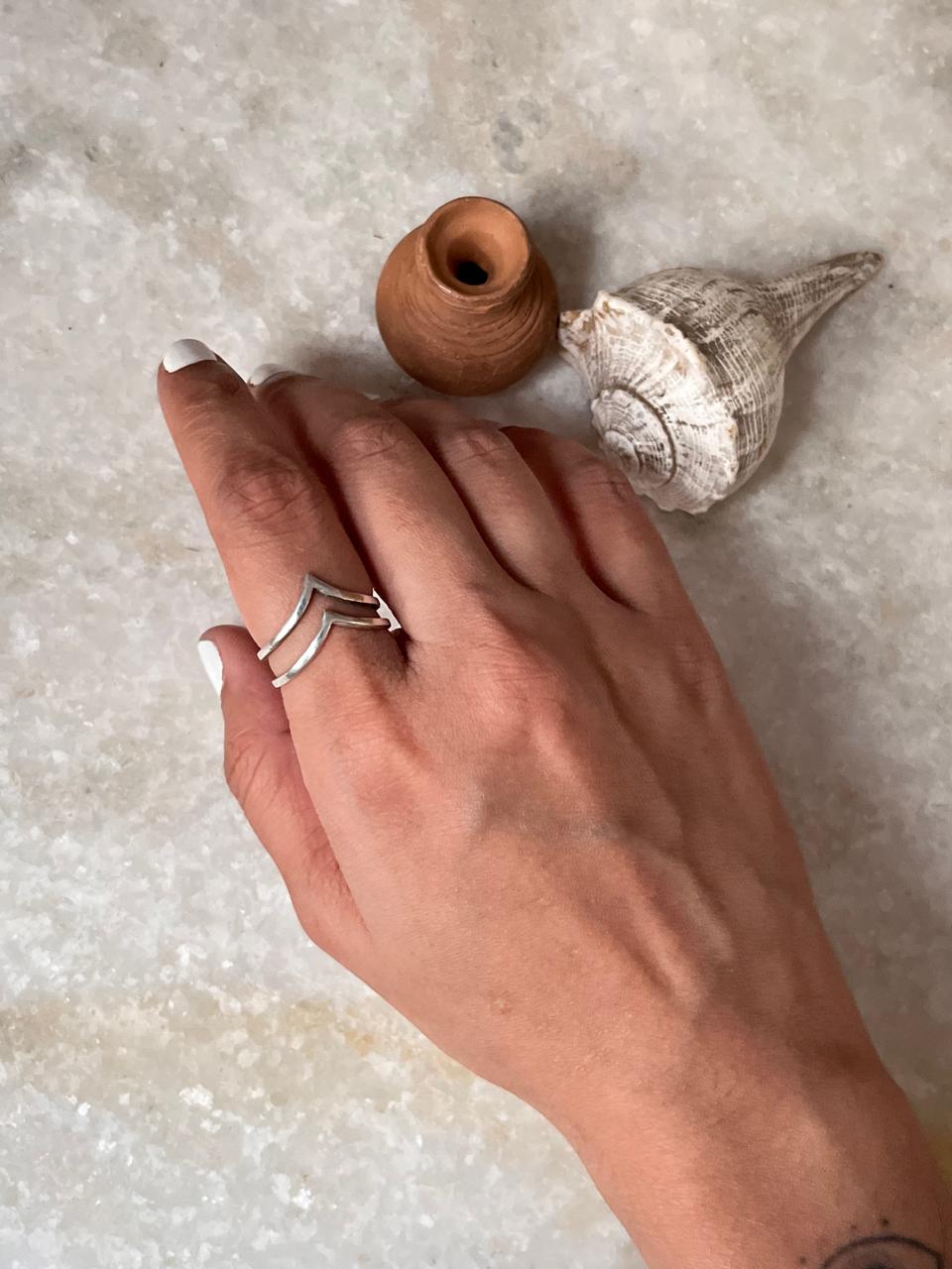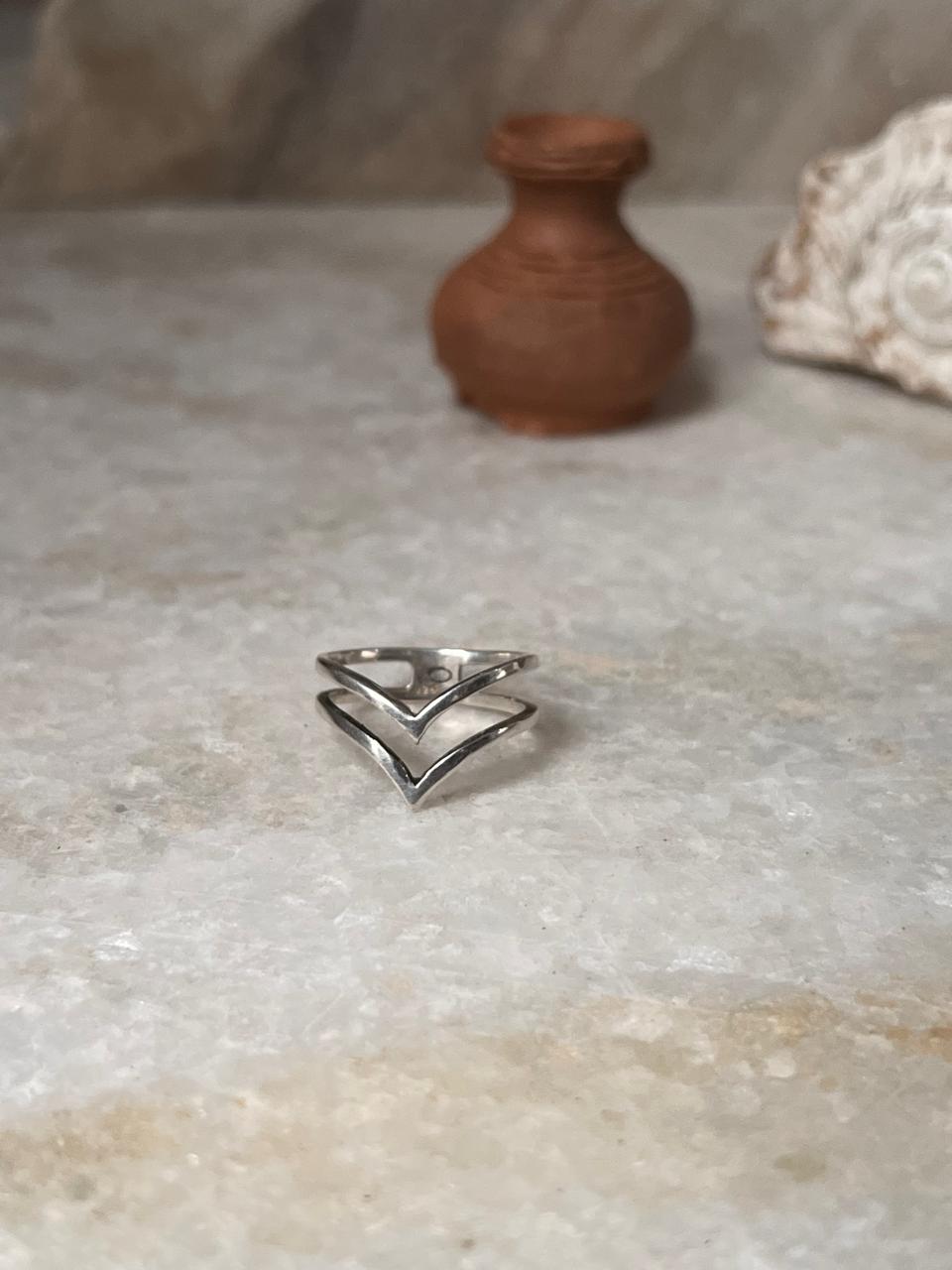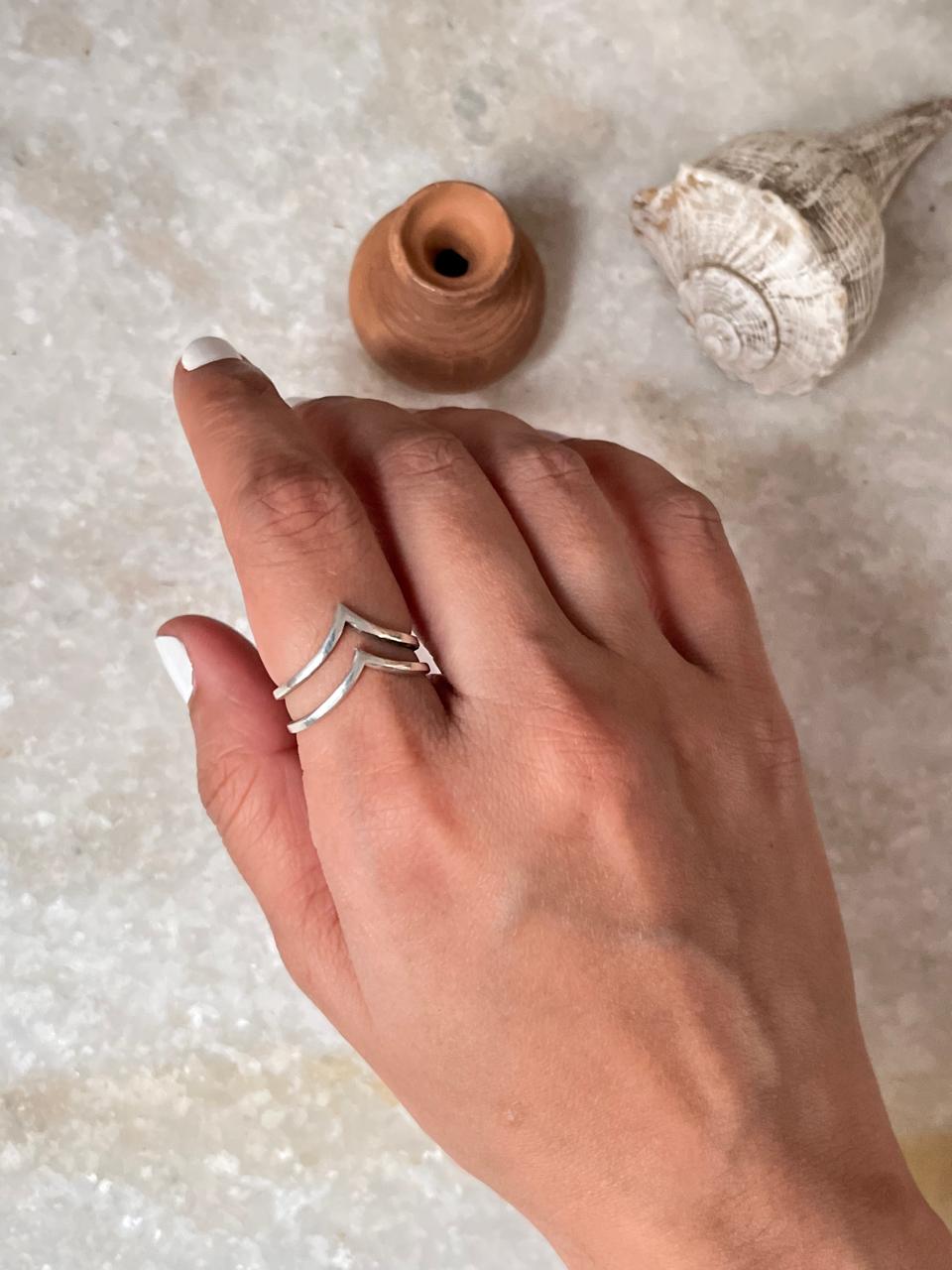 Made of high-quality sterling silver, this ring showcases a unique double v design that can be stacked with other rings for a personalized look.