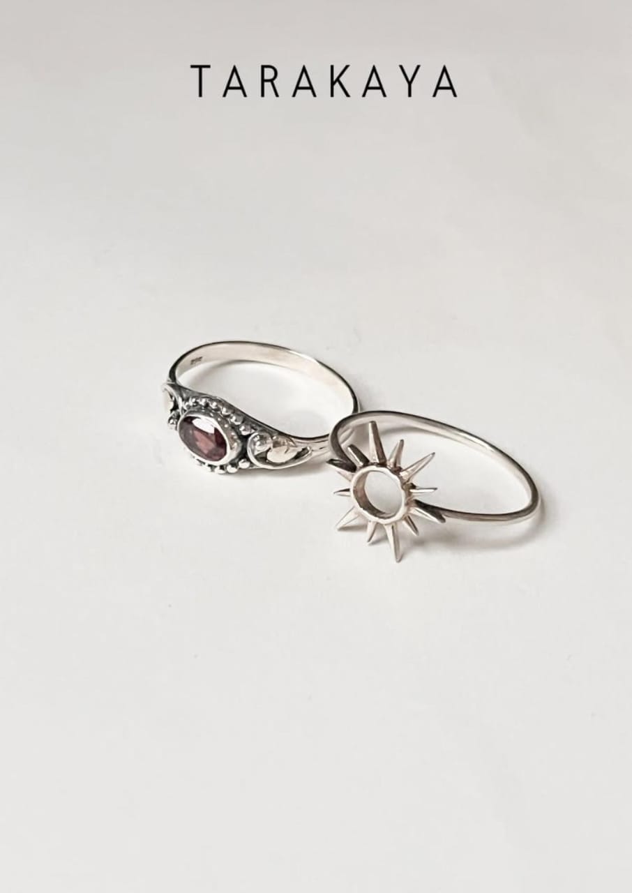 The Garnet Oval Rawa & Minimal Sun/Sunshine Stack 925 Sterling Silver Ring radiates passion, vitality, and warmth. Garnet is a stone of love, strength, and energy, believed to inspire confidence and protect the wearer. The oval rawa design highlights its vintage charm, while the sun motif symbolizes life, positivity, and renewal. Together, this sterling silver stack ring embodies strength, joy, and timeless elegance.