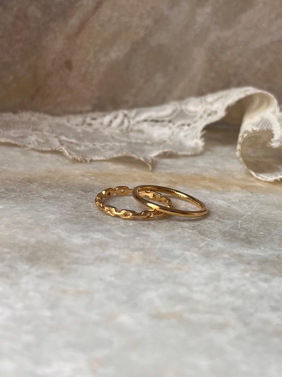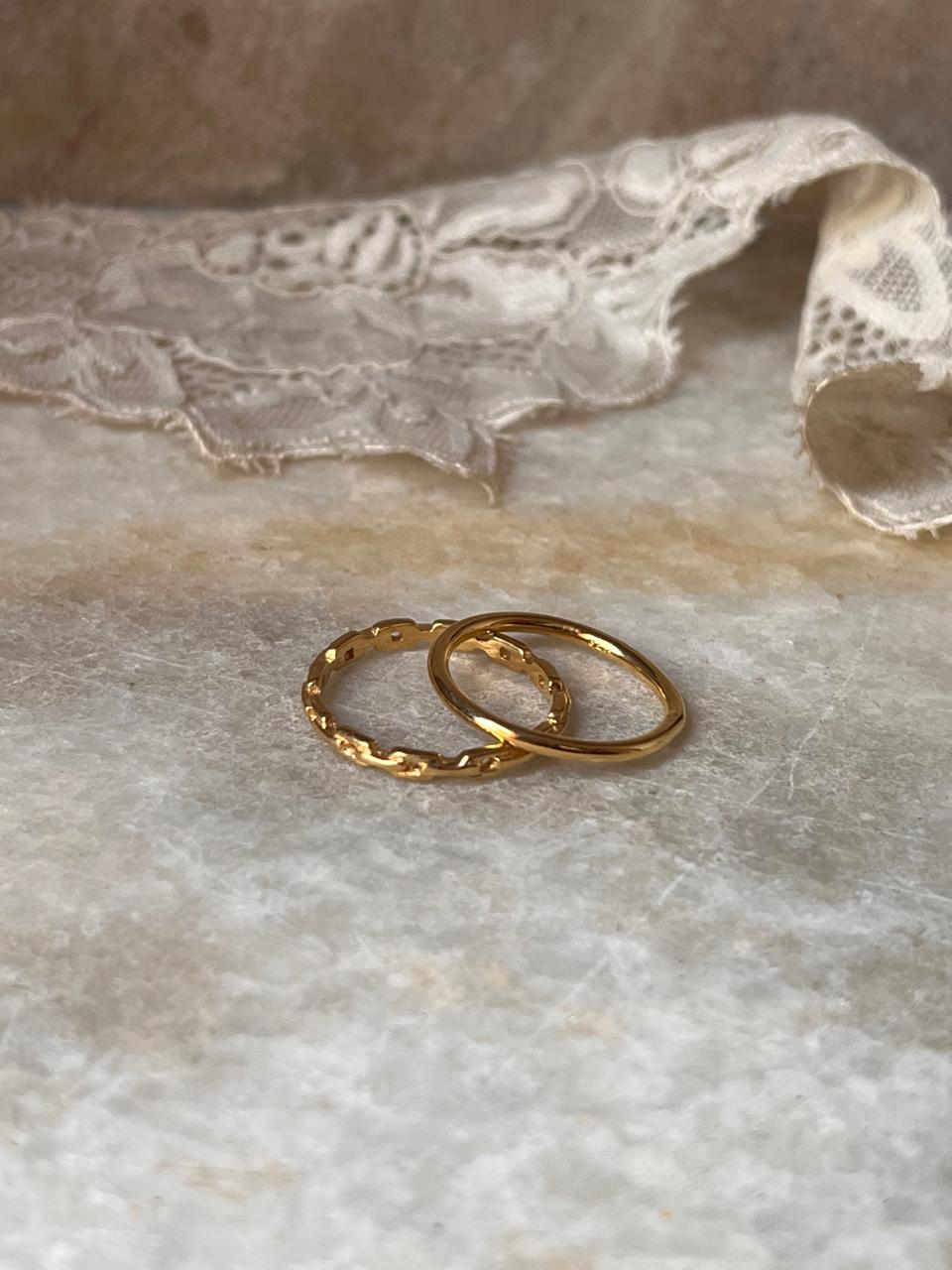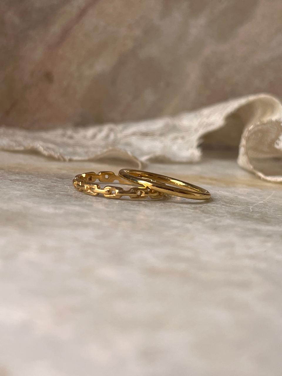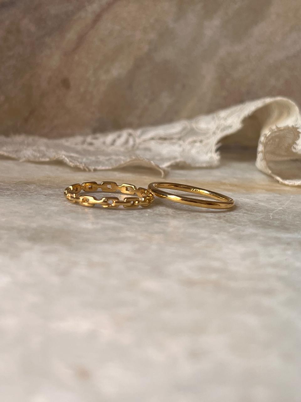 The Gold Vermeil Plain Round & Thin Link Band Stack Set 925 Sterling Silver Ring offers timeless simplicity with a modern twist. Featuring a smooth, polished plain round band paired with a delicate thin link band, both crafted in radiant gold vermeil over sterling silver, this set embodies understated elegance and versatility. Perfect for stacking or wearing individually, it symbolizes harmony and balance, making it a chic addition to any jewelry collection.