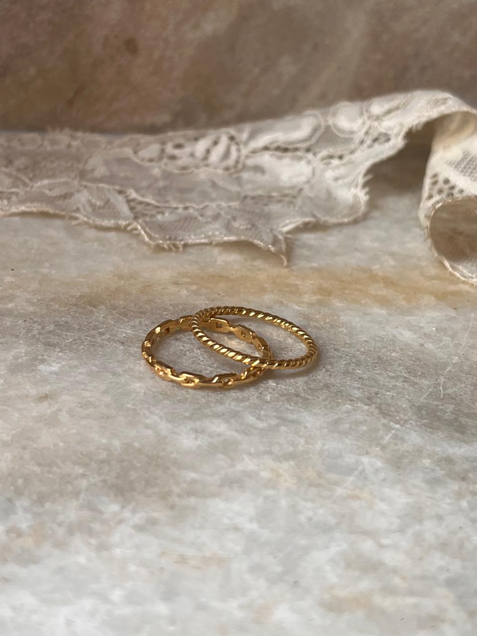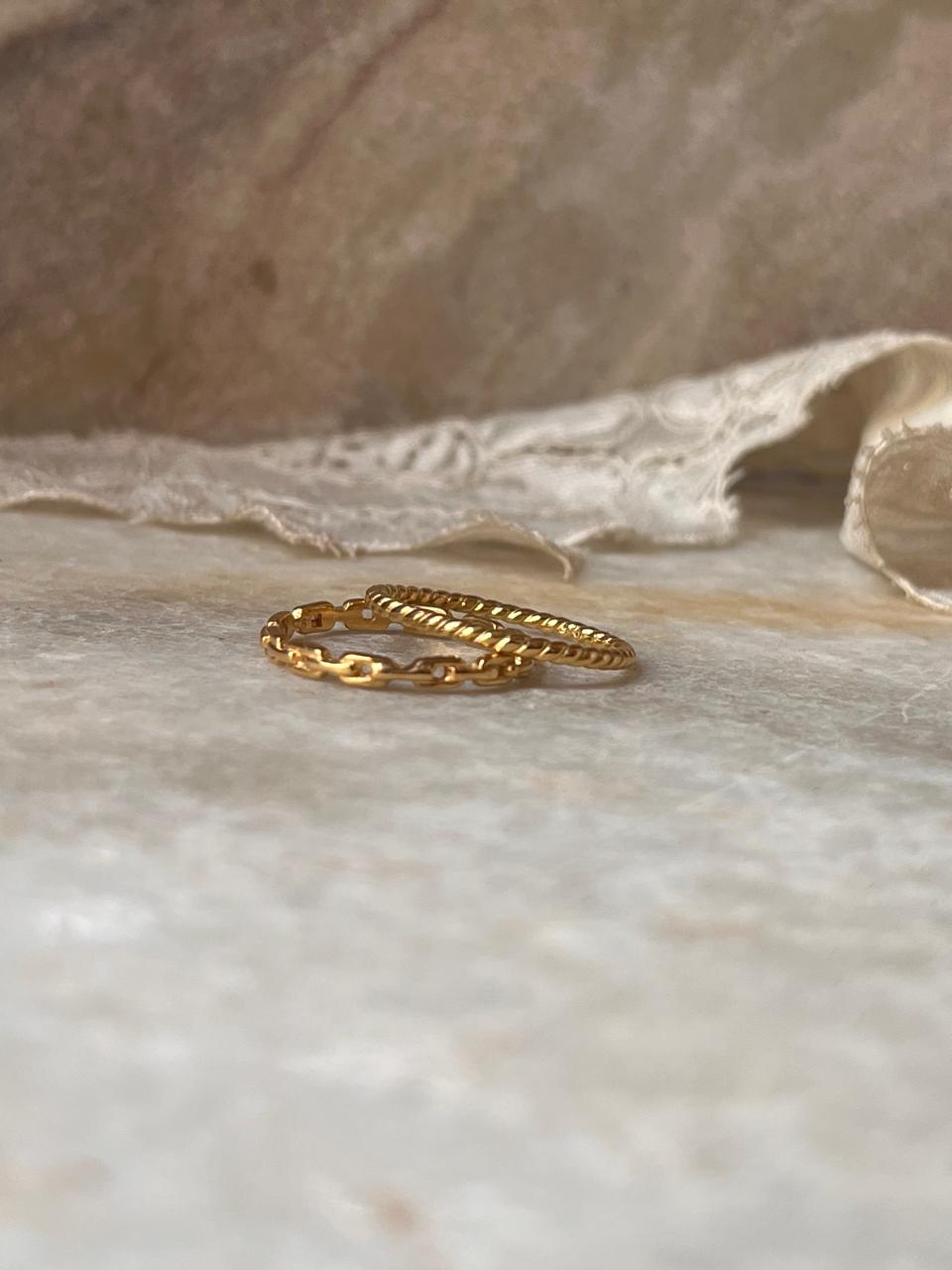 The Gold Vermeil Rope & Thin Link Band Stack Set 925 Sterling Silver Ring offers a delicate yet textured layering option. Featuring a twisted rope band paired with a sleek thin link band, both crafted in warm gold vermeil over sterling silver, this set beautifully balances intricate detail with minimalist elegance. Perfect for stacking or wearing alone, it symbolizes connection and timeless style, making it a versatile addition to any jewelry collection.