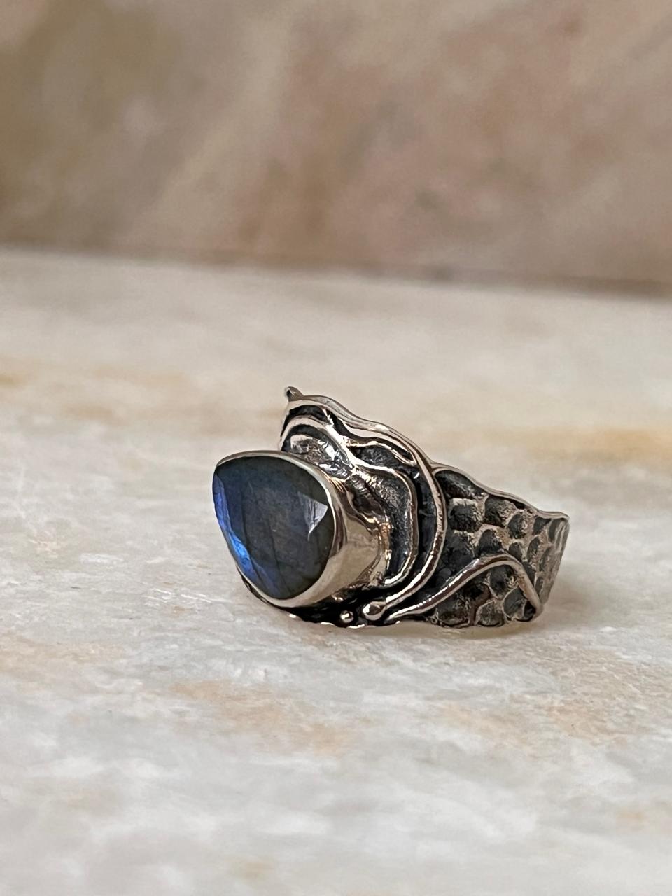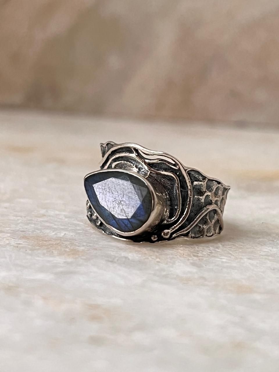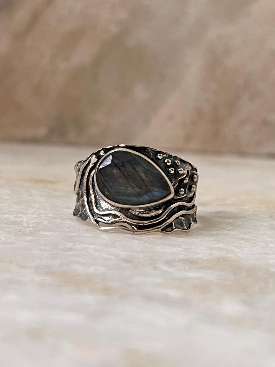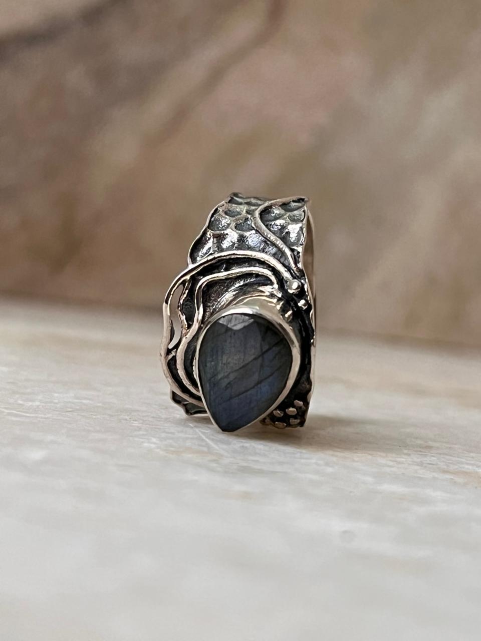 Expertly crafted and beautifully designed, our Labradorite Pear Rustic Silver Ring showcases the unique beauty of this semi-precious stone.