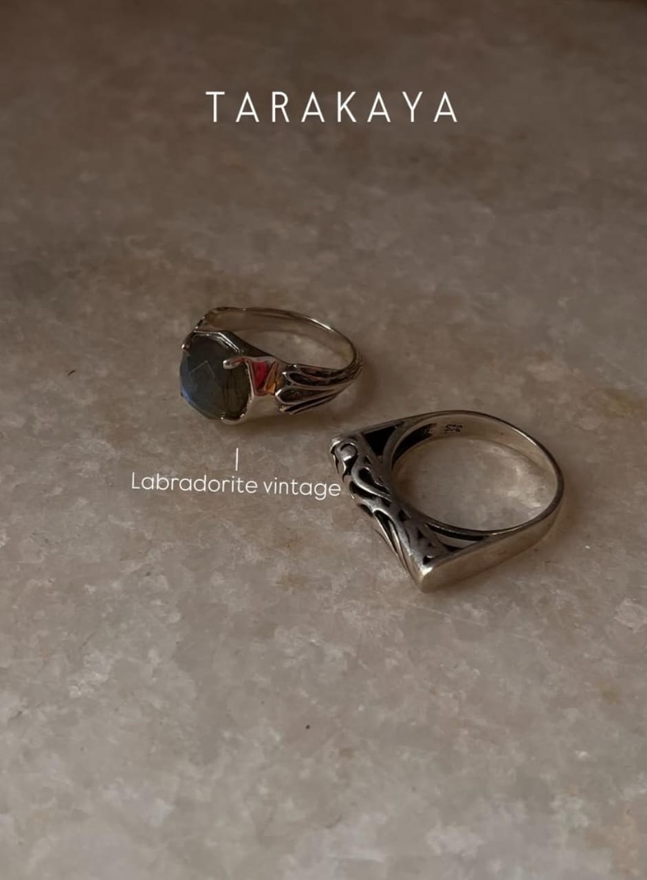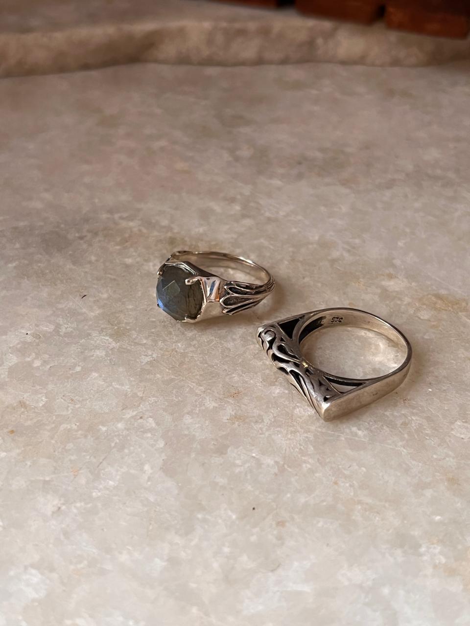 Labradorite Vintage Goth Style Checker & Vintage Motif Signet 925 Sterling Silver Stack Set Ring