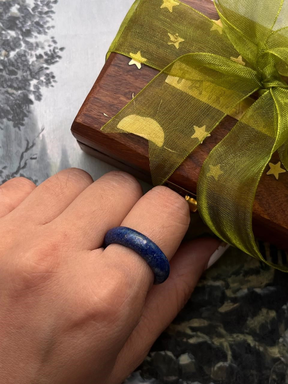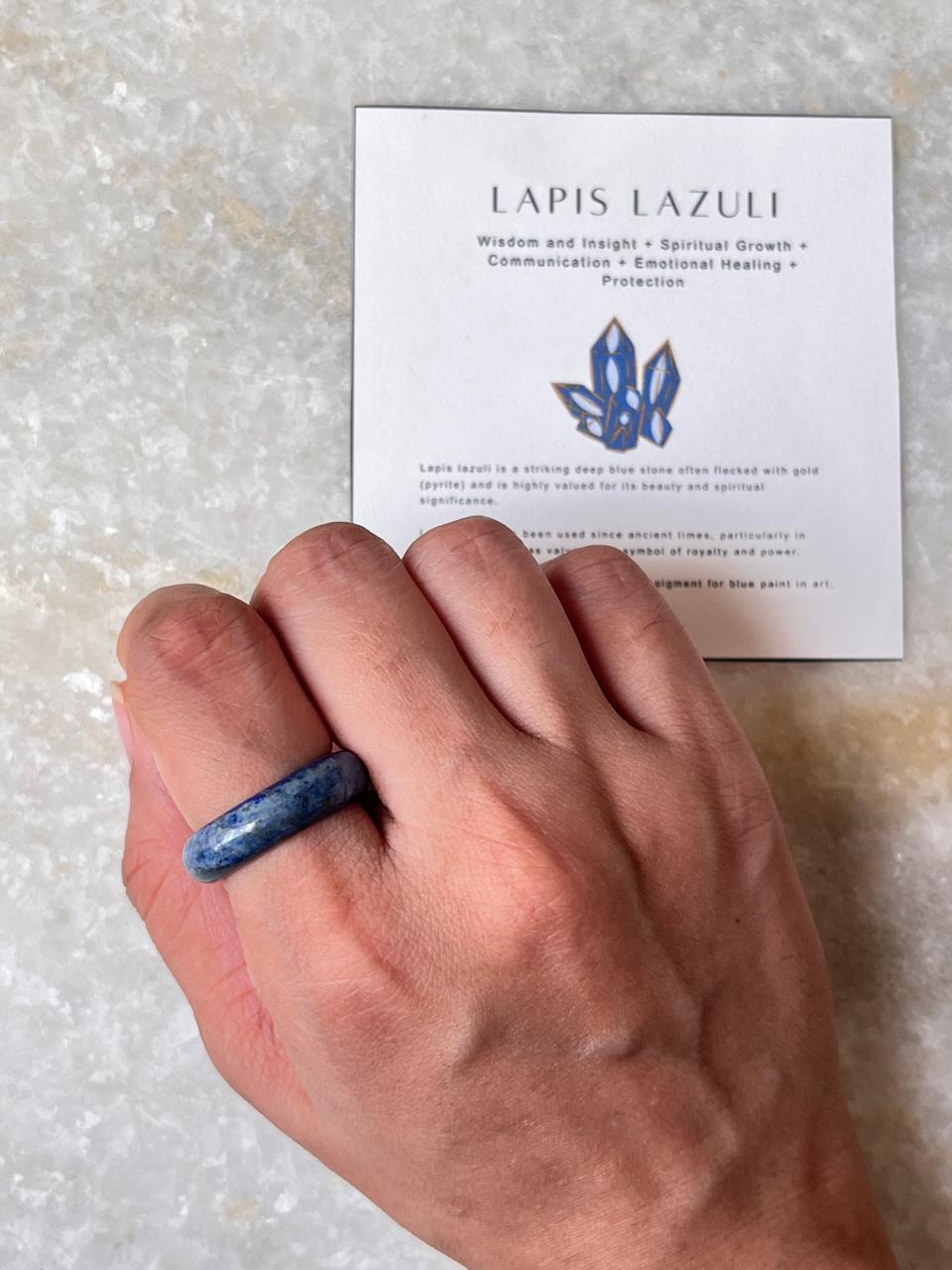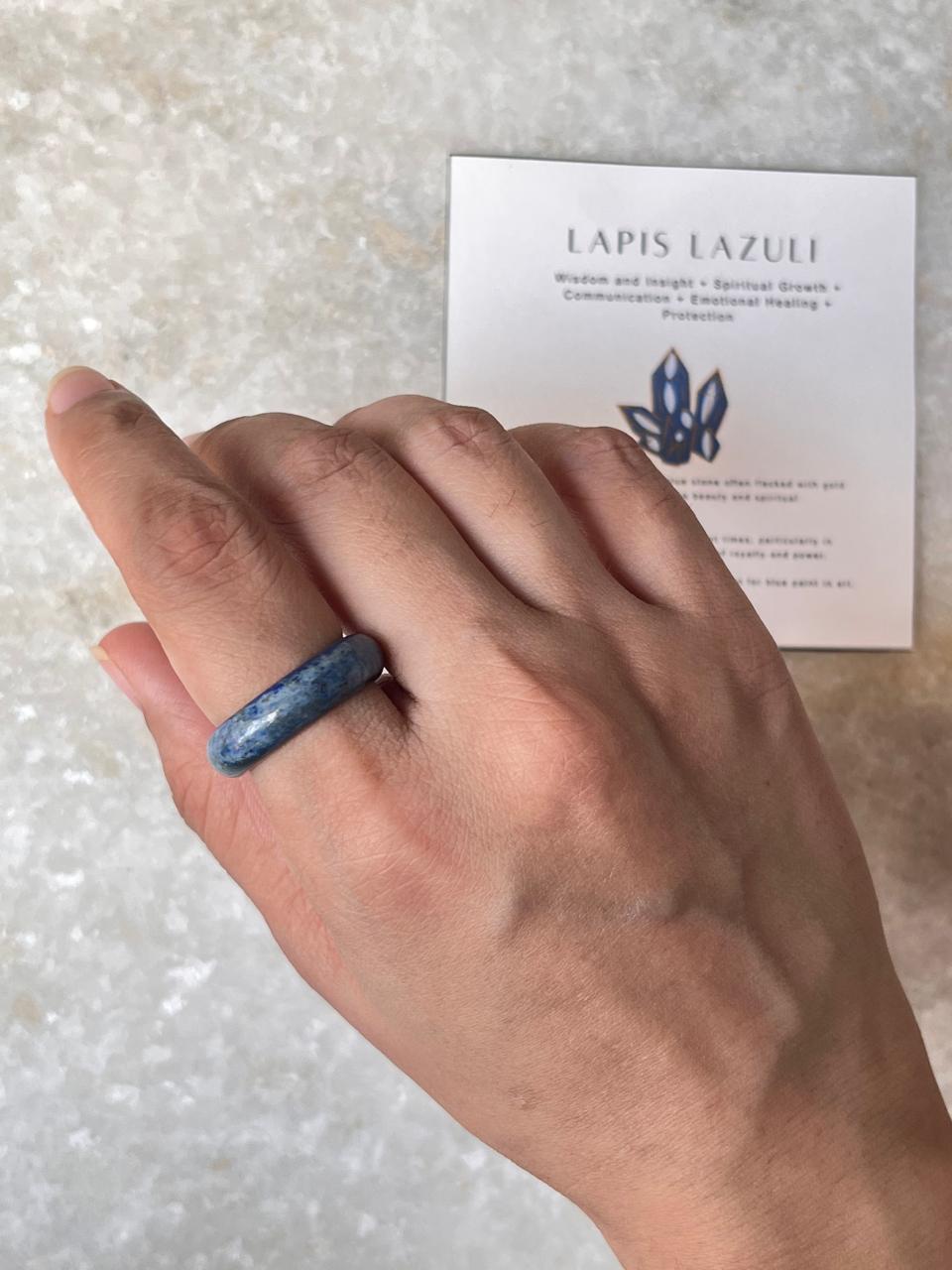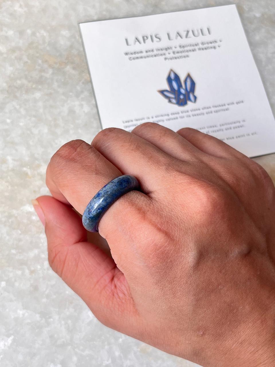 The Lapis Lazuli Crystal Band Ring is a striking piece that showcases the deep blue beauty of lapis lazuli, a stone revered for its connection to wisdom, truth, and spiritual insight. Known for its rich color and golden flecks, lapis lazuli is believed to enhance mental clarity, promote self-awareness, and encourage inner peace. Set in a sleek, minimalist band, this ring makes a bold statement while offering powerful metaphysical benefits. Ideal for those seeking both style and spiritual growth, it’s a timeless addition to any jewelry collection.