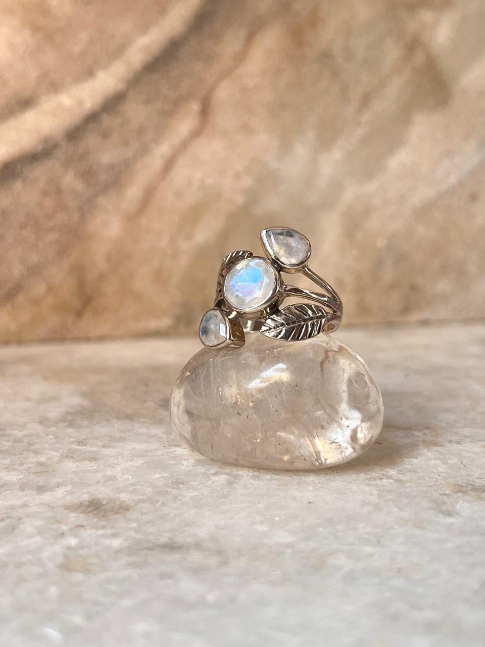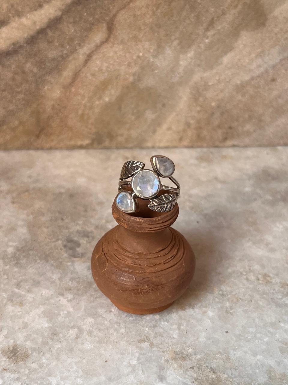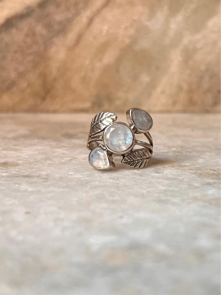 Expertly crafted with a genuine moonstone center, the Moonstone Forest Statement Silver Ring exudes natural beauty and elegance. Its unique design showcases the stone's ethereal quality, making it a stunning addition to any outfit.