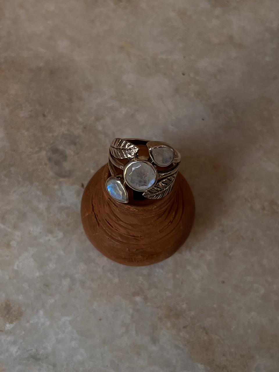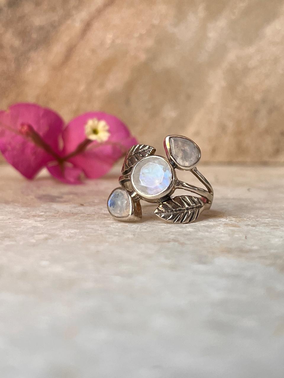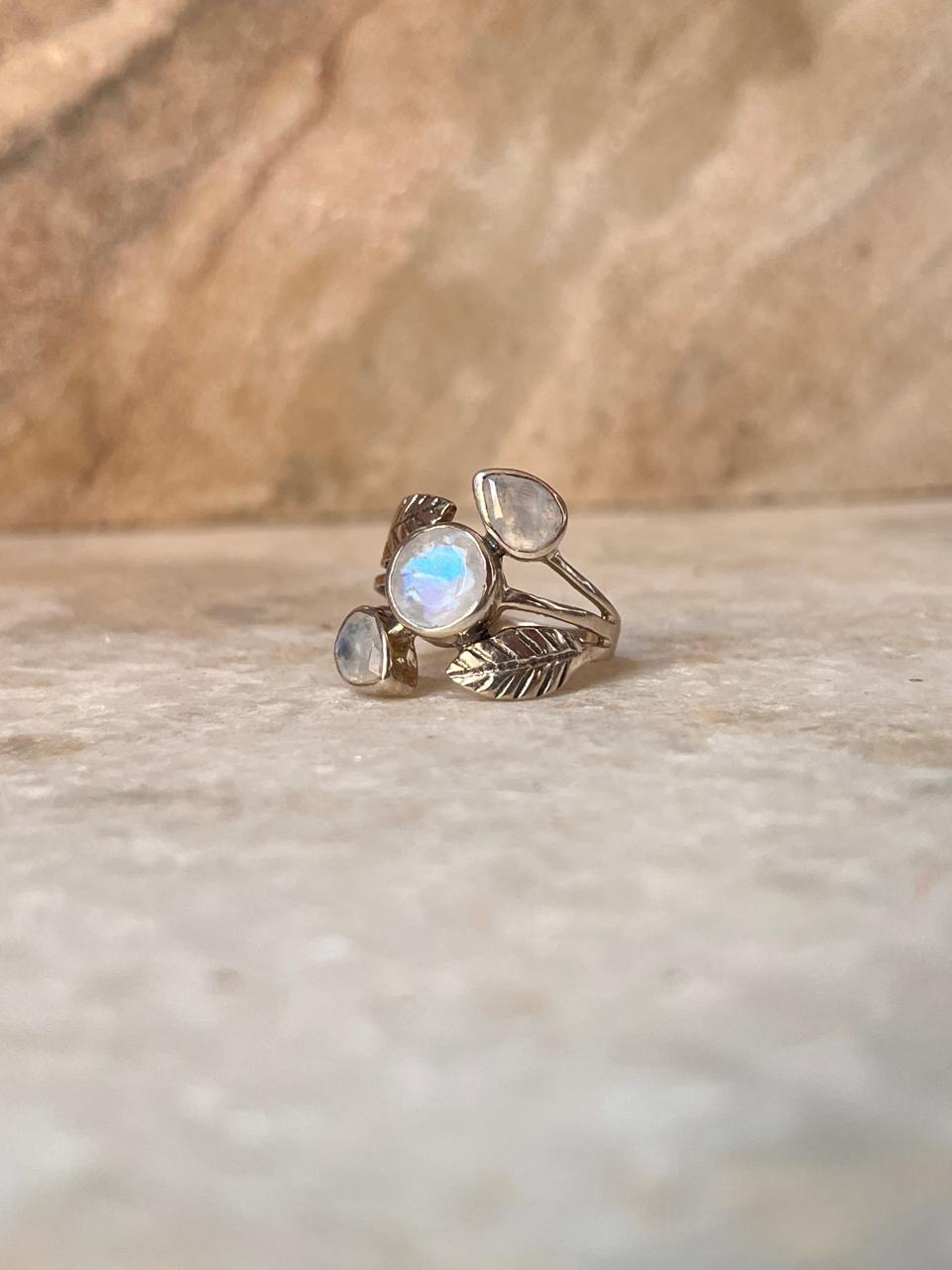 Expertly crafted with a genuine moonstone center, the Moonstone Forest Statement Silver Ring exudes natural beauty and elegance. Its unique design showcases the stone's ethereal quality, making it a stunning addition to any outfit.