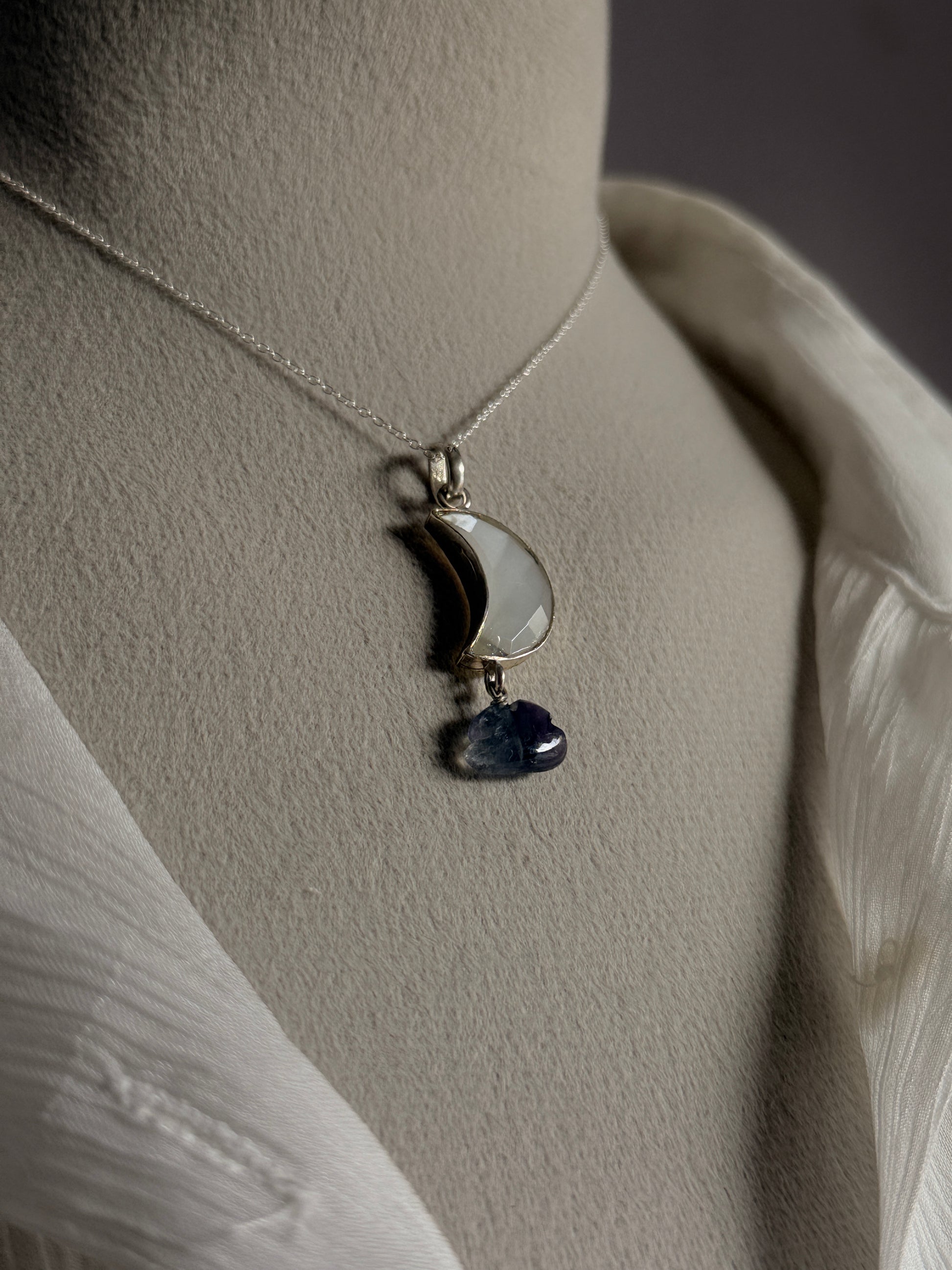 The Moonstone Moon Fluorite Cloud 925 Sterling Silver Pendant beautifully combines the ethereal glow of Moonstone with the calming energy of Fluorite, all set in high-quality 925 sterling silver. The crescent moon, symbolizing intuition and transformation, is paired with the soothing energy of Fluorite, known for its ability to clear negative energies and enhance mental clarity. Moonstone, with its mystical shimmer, supports emotional balance and spiritual growth. The design evokes a dreamy, celestial feel, making this pendant a perfect accessory for those seeking to connect with their inner wisdom, emotional healing, and spiritual enlightenment.