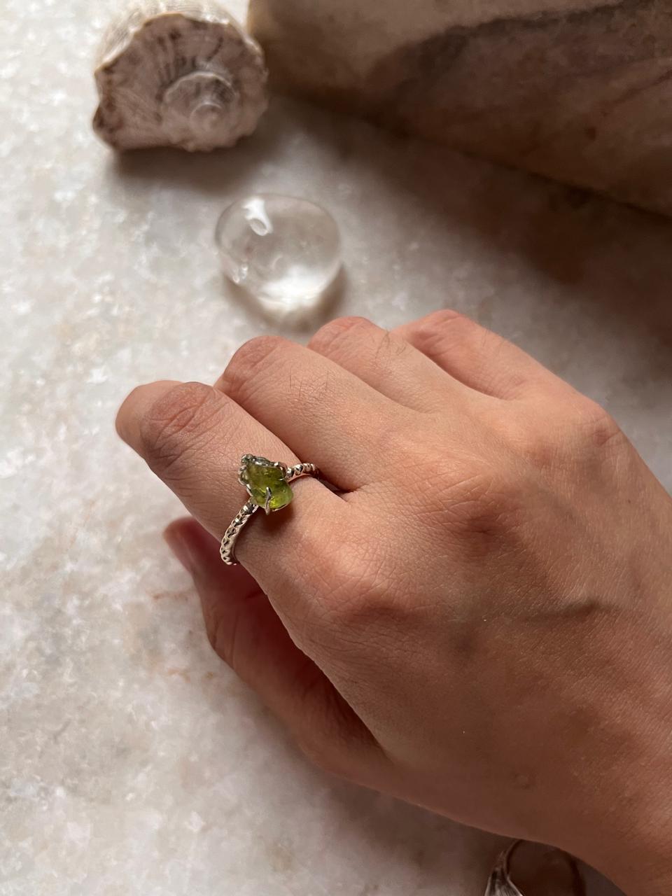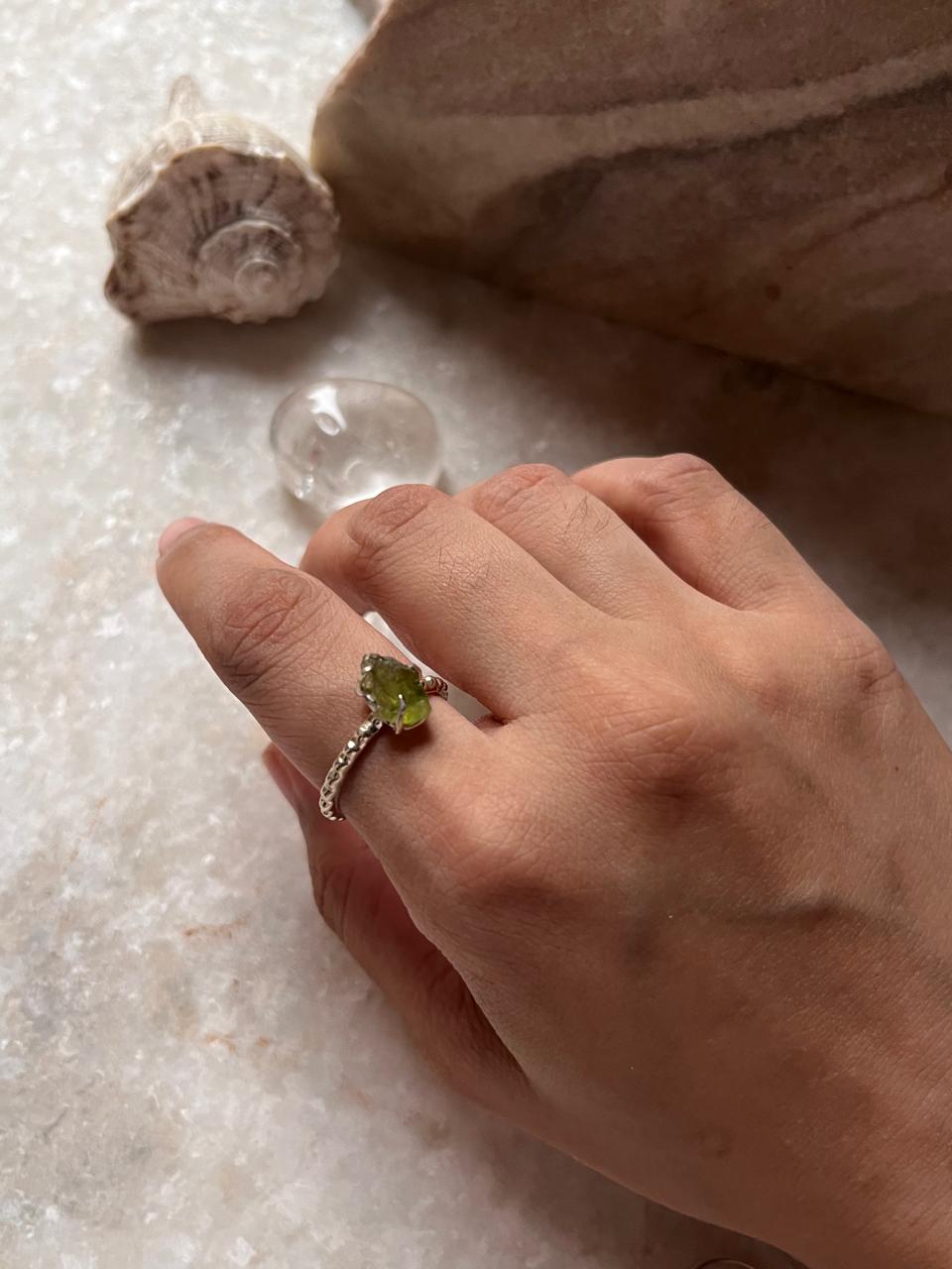 The Peridot Raw Uncut Dot Band 925 Sterling Silver Ring celebrates natural beauty and renewal. Featuring raw, uncut peridot stones set along a delicate dot-patterned band, this ring captures the vibrant green energy of growth, healing, and abundance. Crafted in sterling silver, the textured design adds an earthy, bohemian touch. Wearing this ring is believed to attract positivity, promote emotional balance, and inspire personal transformation, making it a meaningful and stylish accessory.