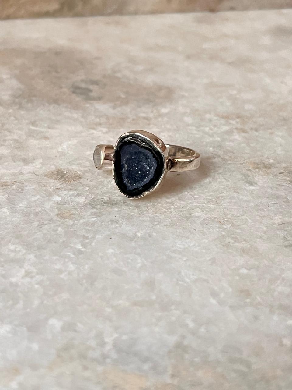 Blue Coconut Druzy Geode With Moonstone Sterling Silver 925 Ring