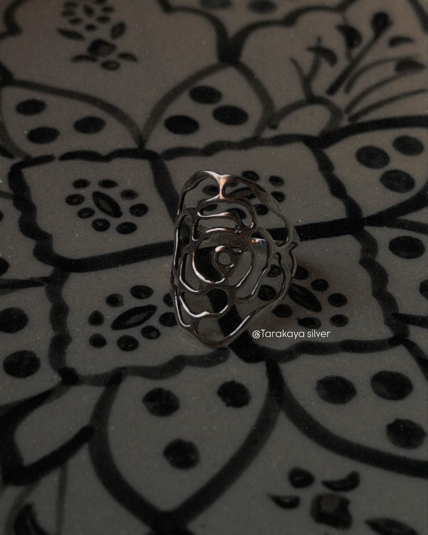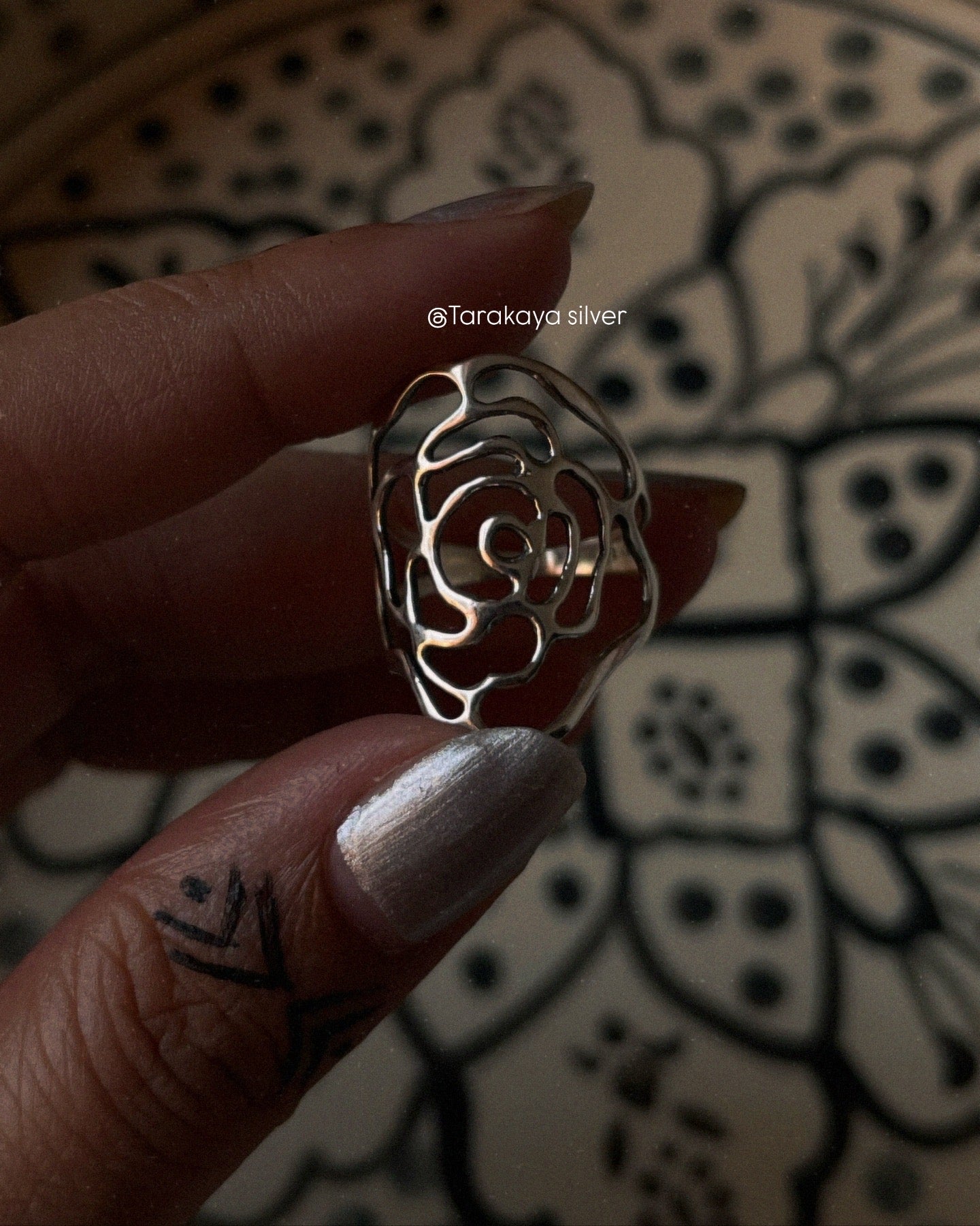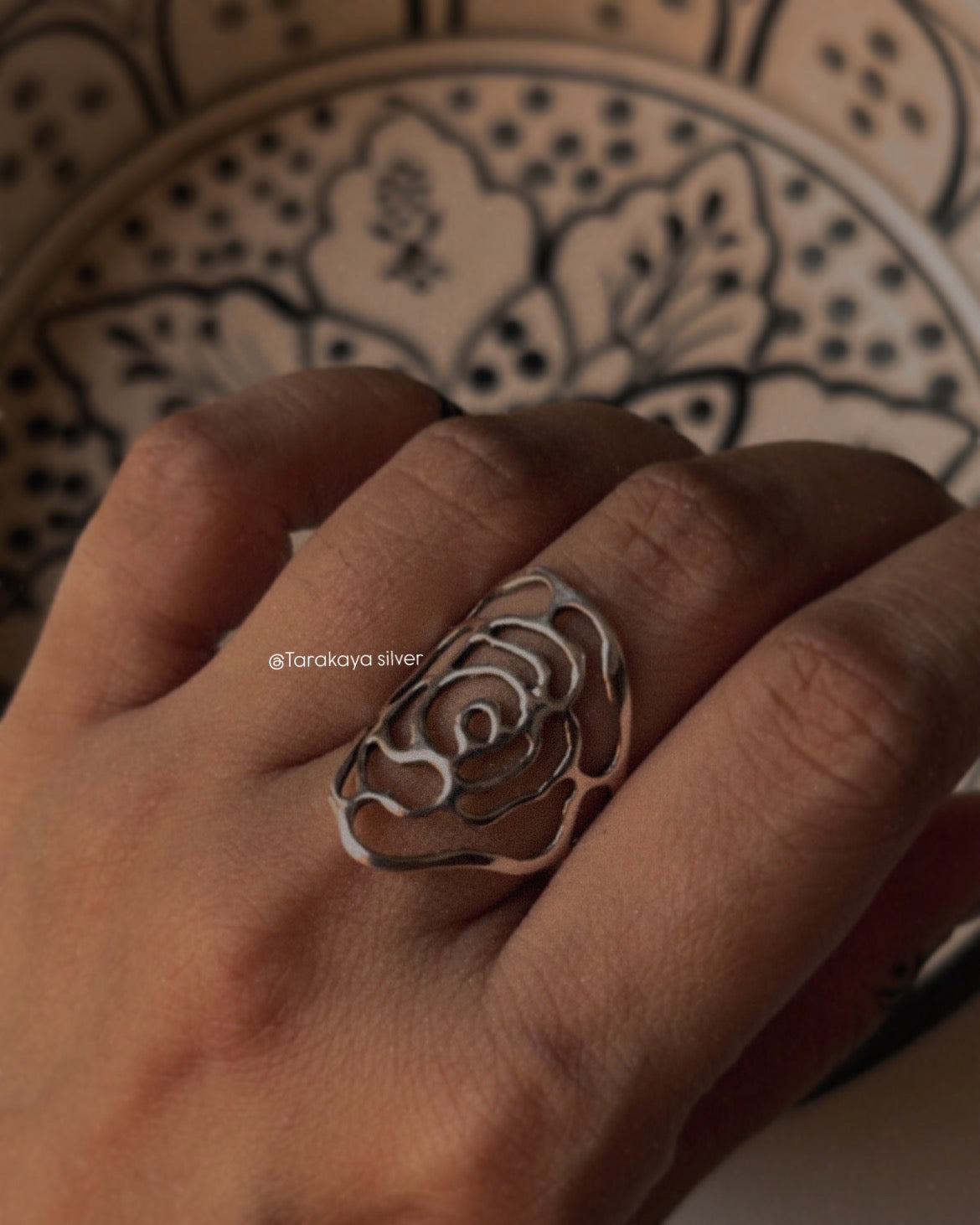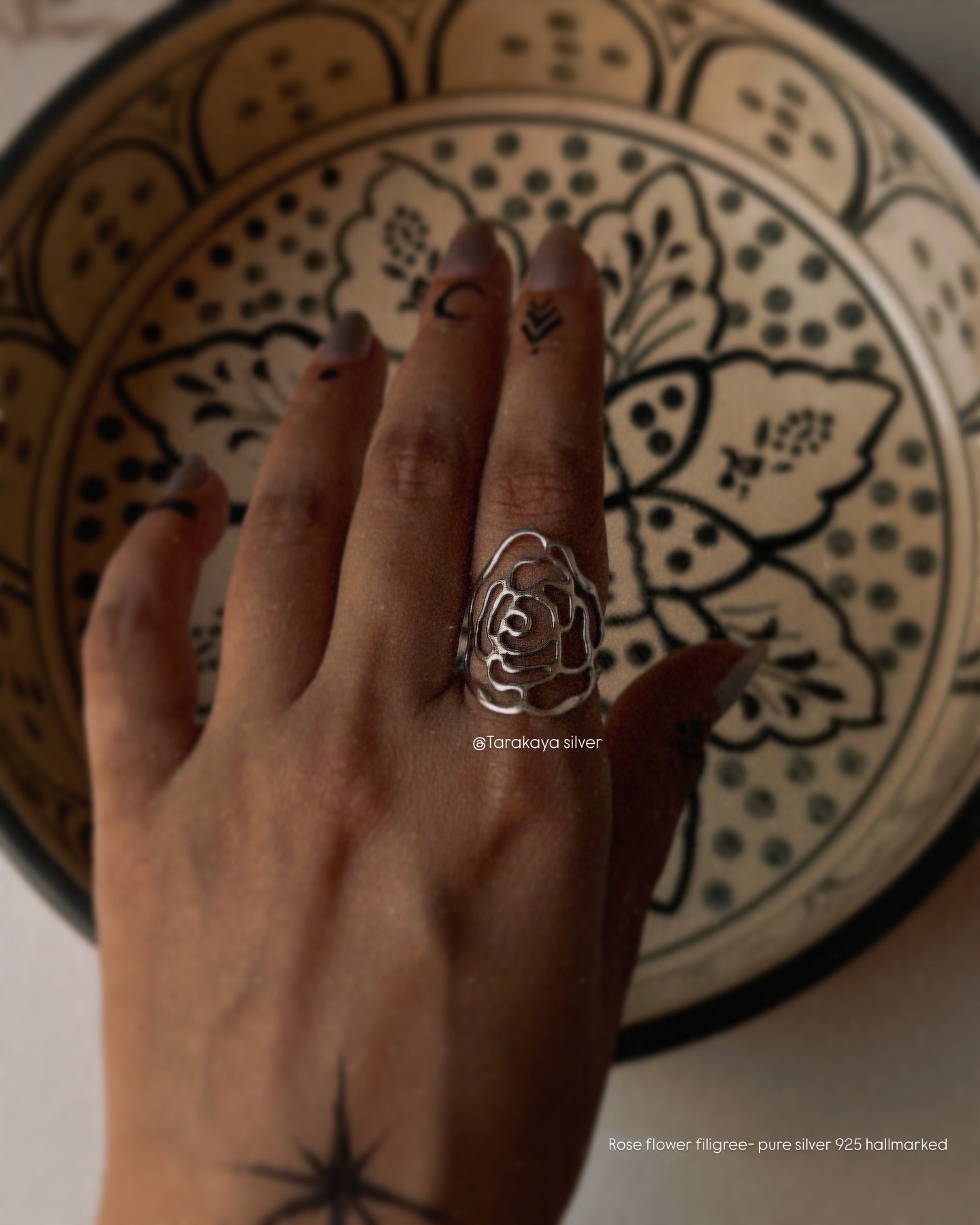"This rose filigree ring combines classic elegance with intricate craftsmanship. Its delicate floral pattern brings a romantic and vintage-inspired touch to any outfit."