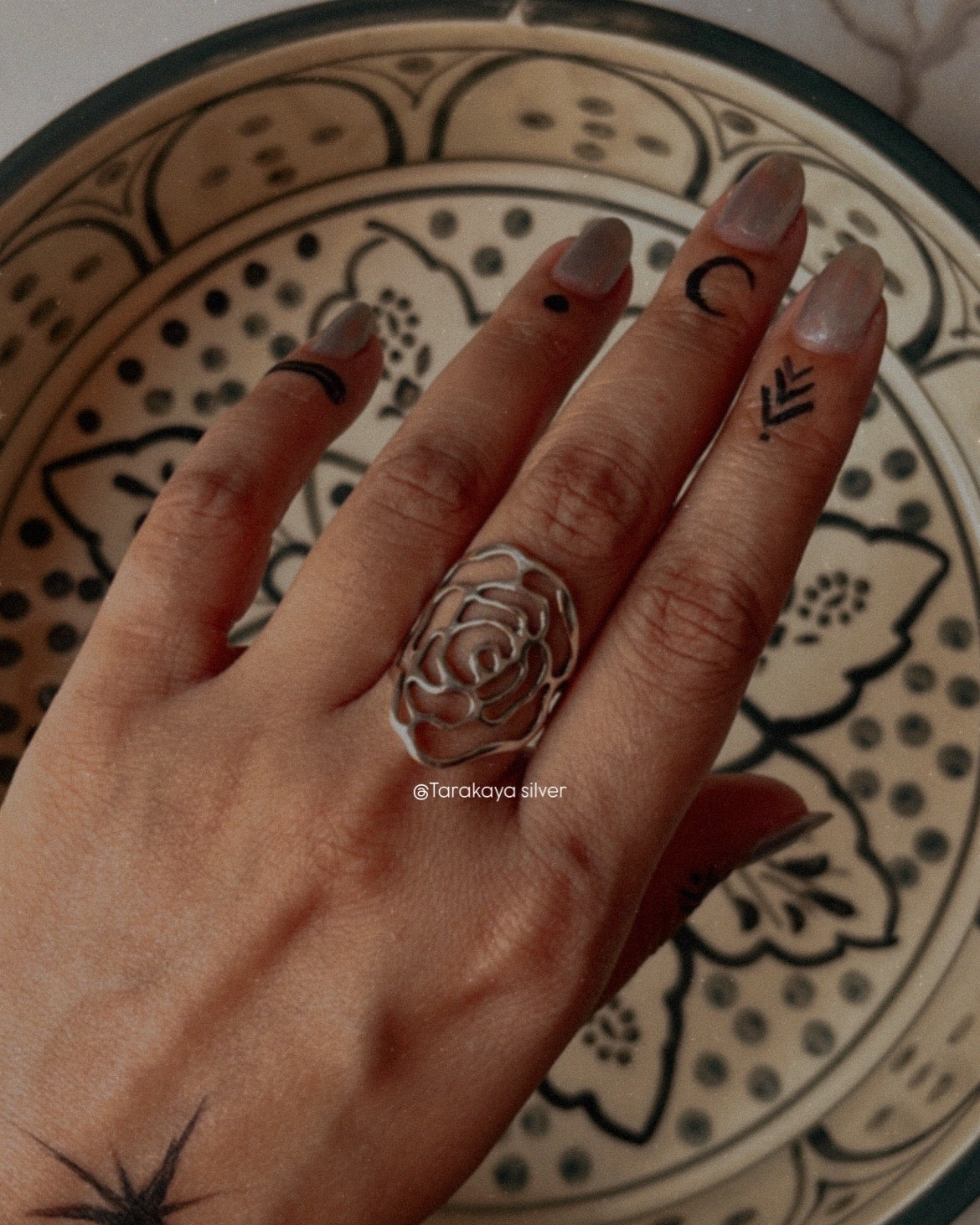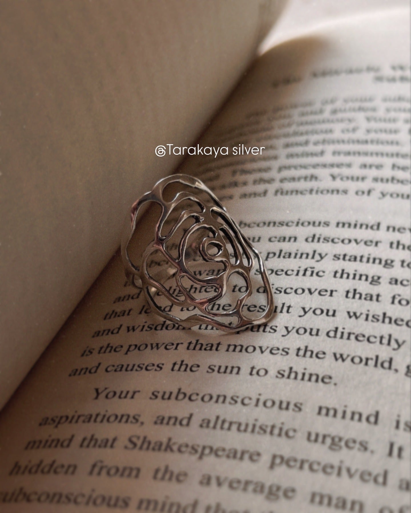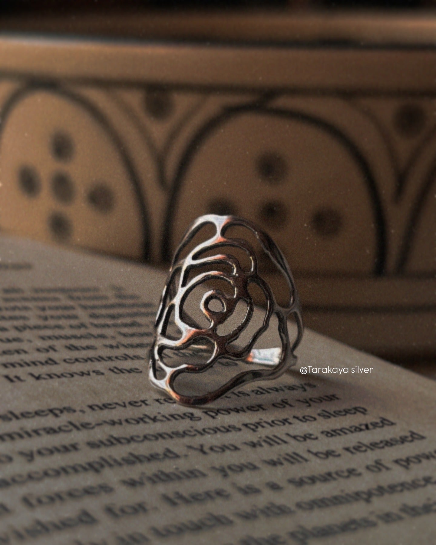 "This rose filigree ring combines classic elegance with intricate craftsmanship. Its delicate floral pattern brings a romantic and vintage-inspired touch to any outfit."