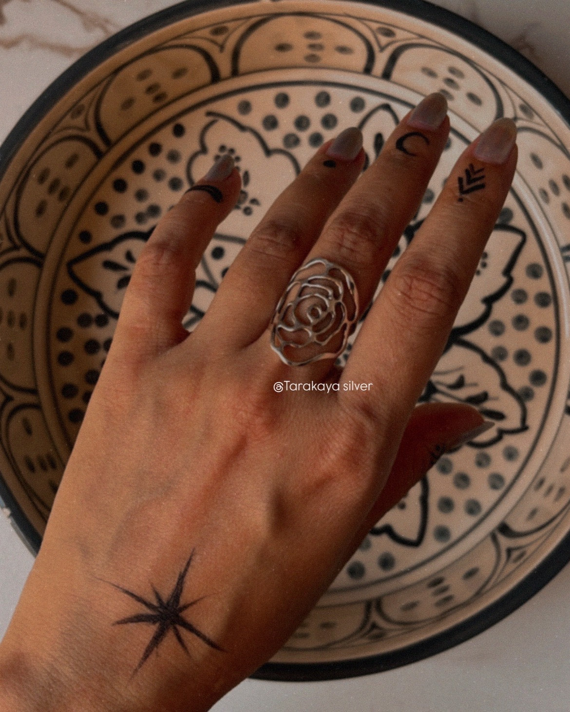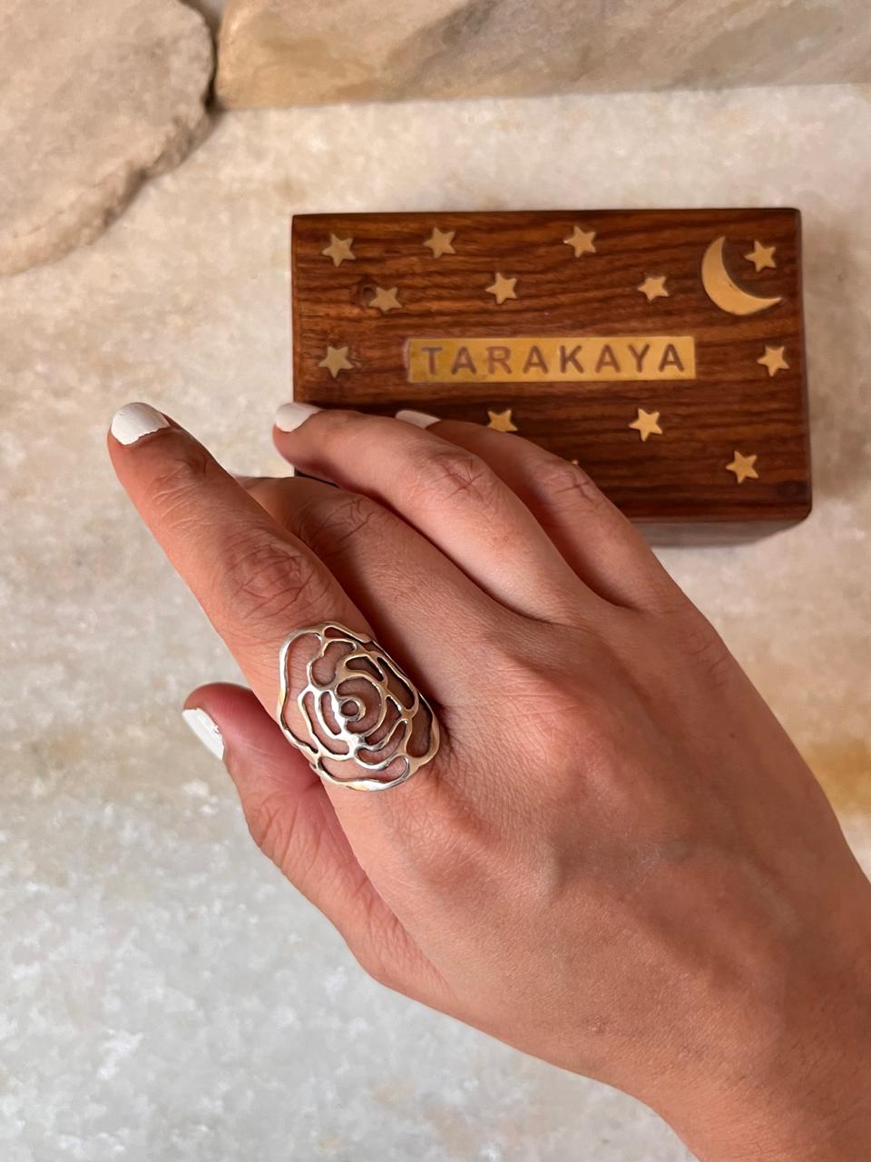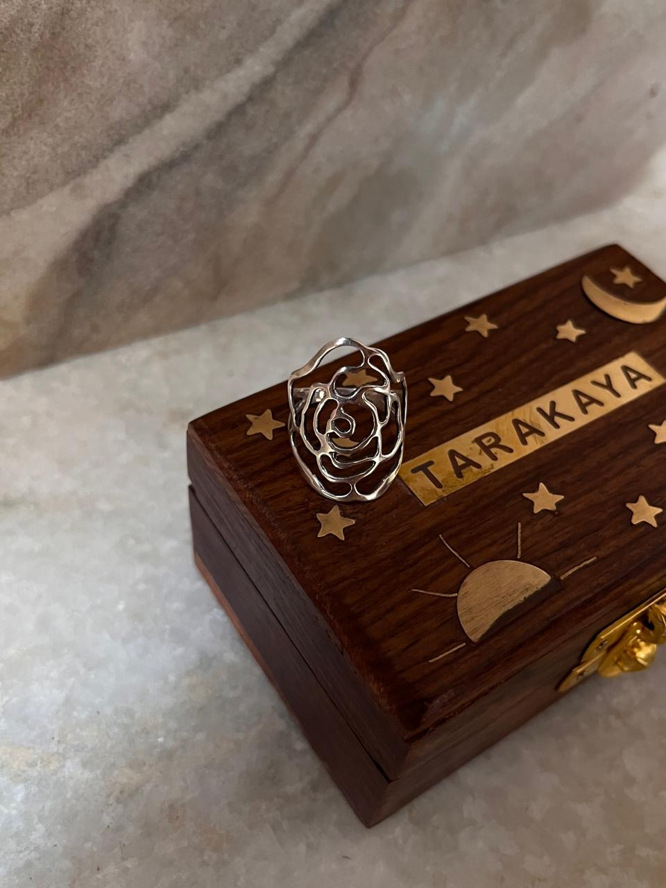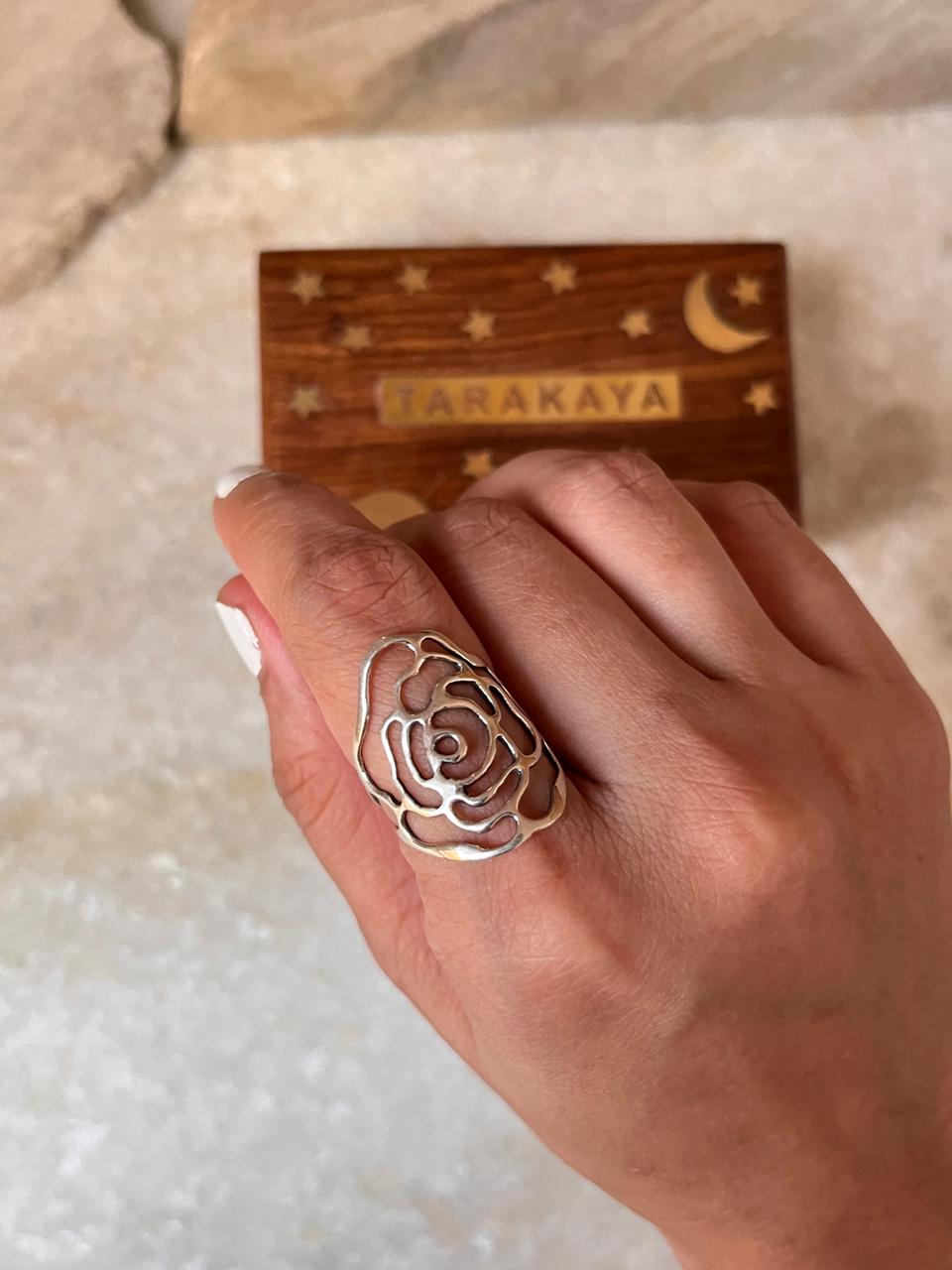 "This rose filigree ring combines classic elegance with intricate craftsmanship. Its delicate floral pattern brings a romantic and vintage-inspired touch to any outfit."