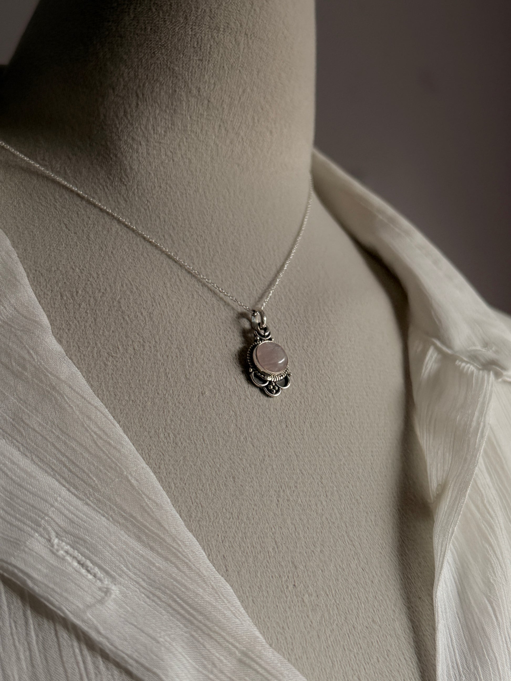 Rose Quartz Boho Round 925 Sterling Silver Pendant