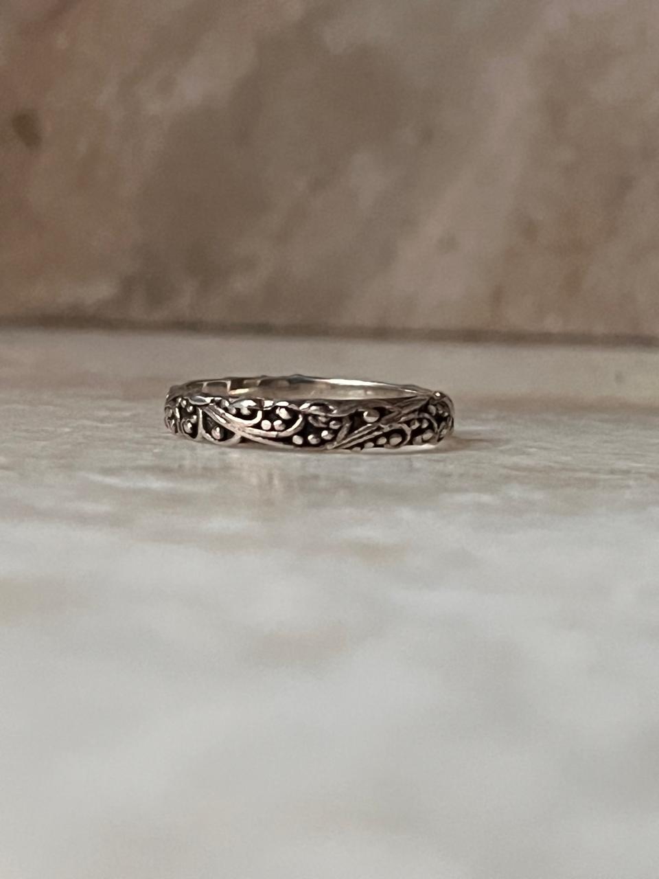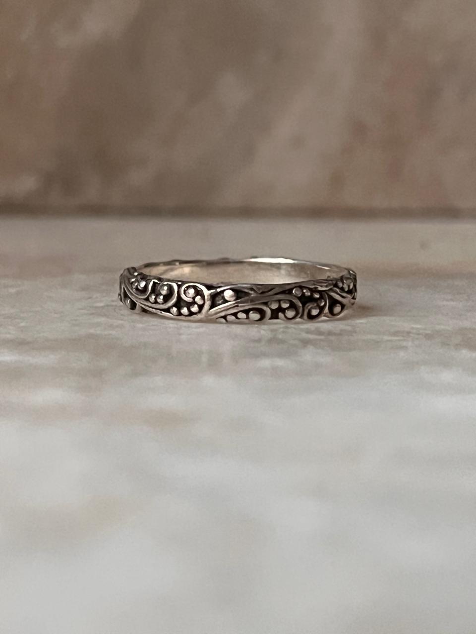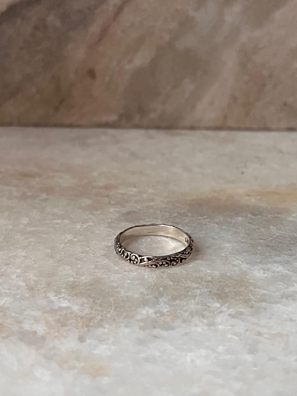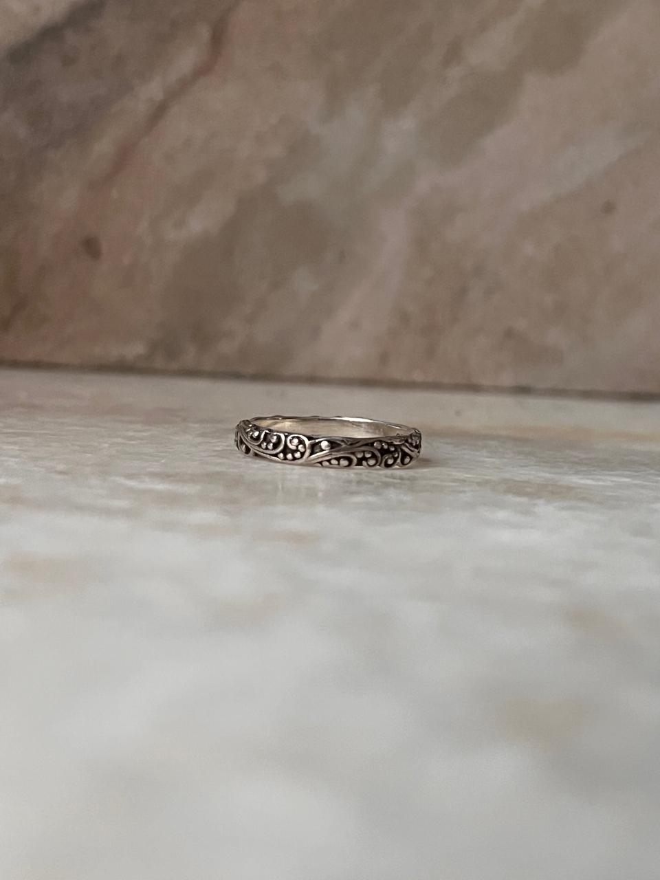 This stackable silver band ring features a vintage motif design, perfect for daily wear.