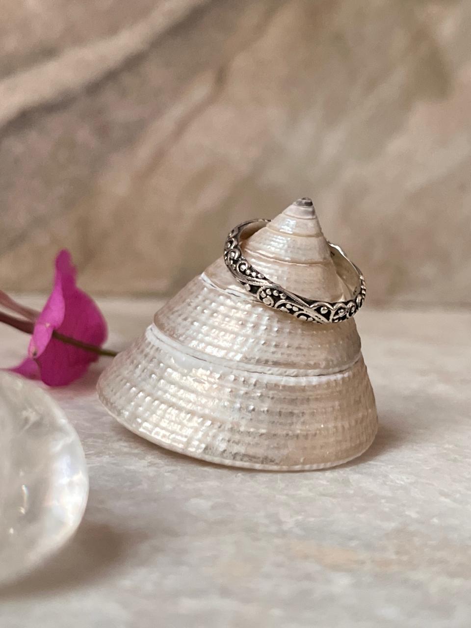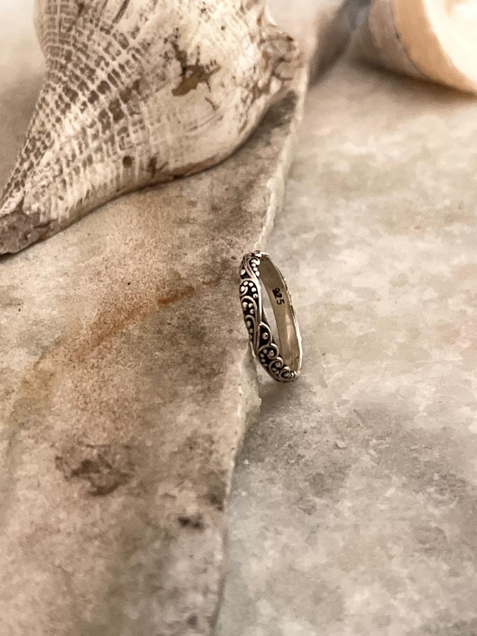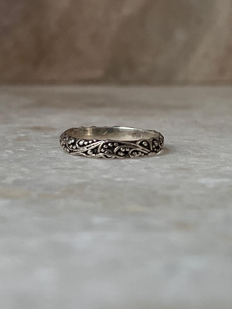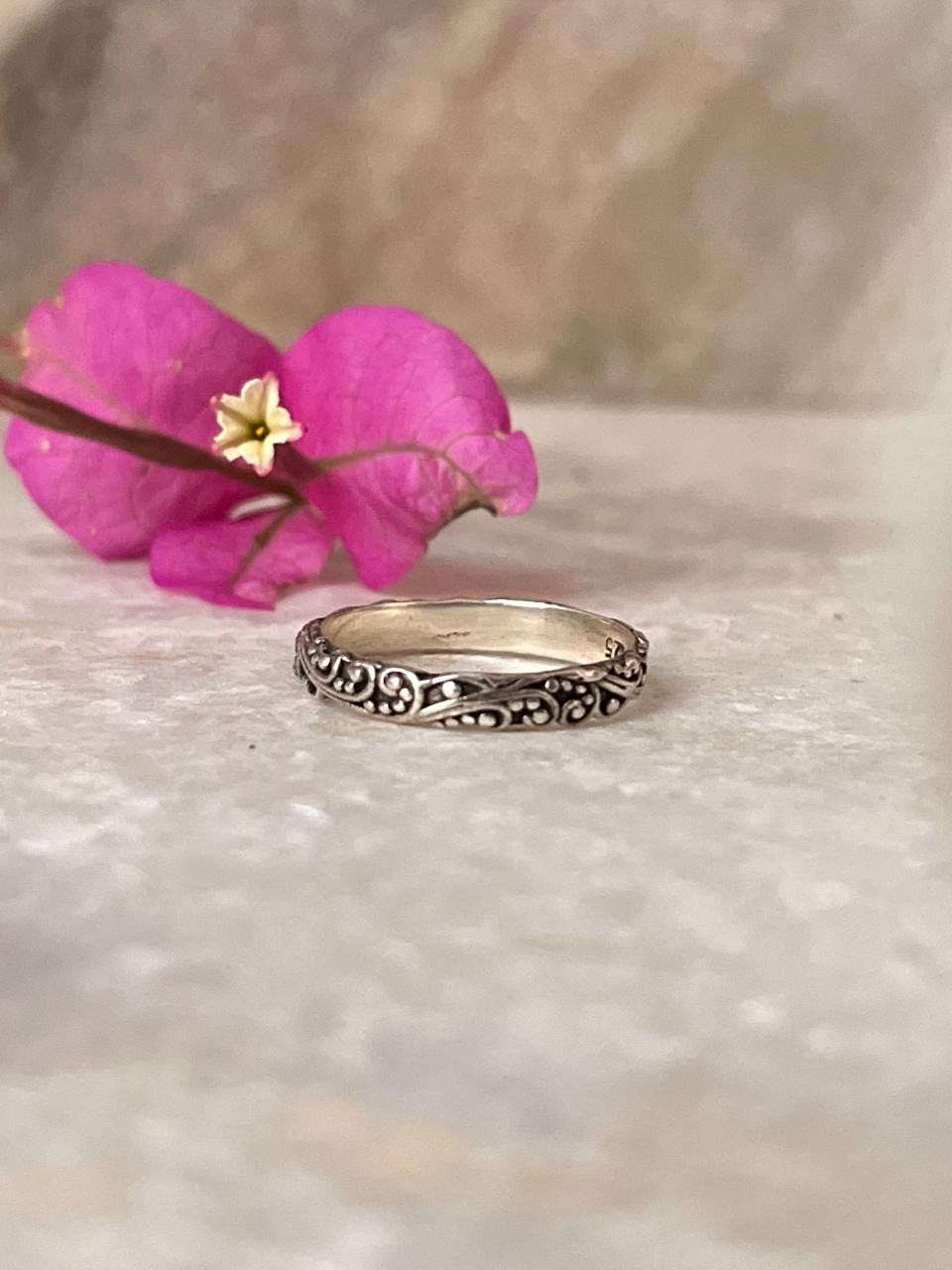 This stackable silver band ring features a vintage motif design, perfect for daily wear.