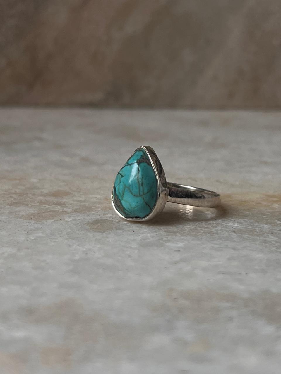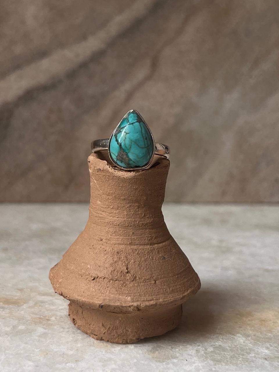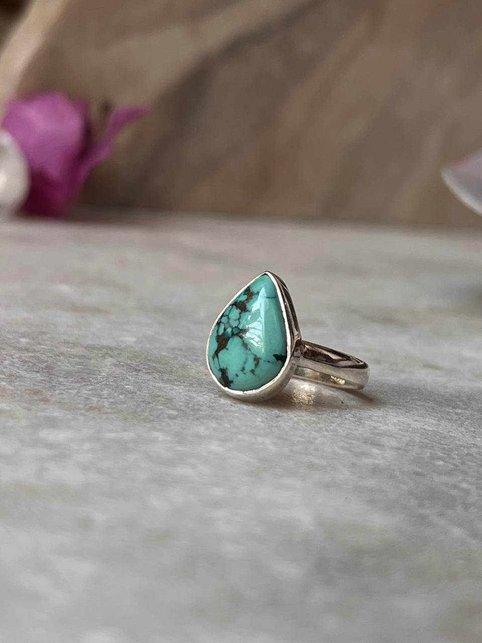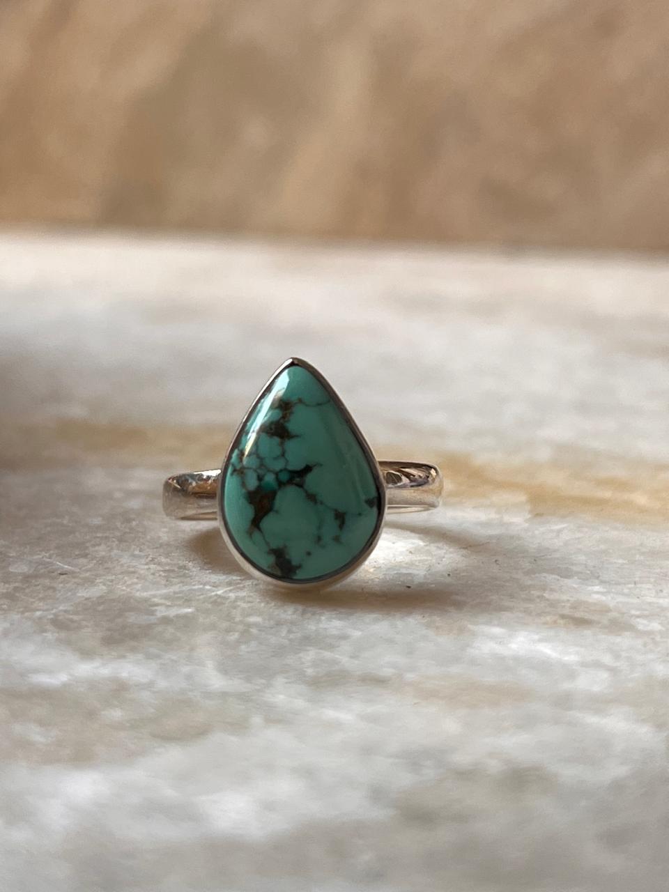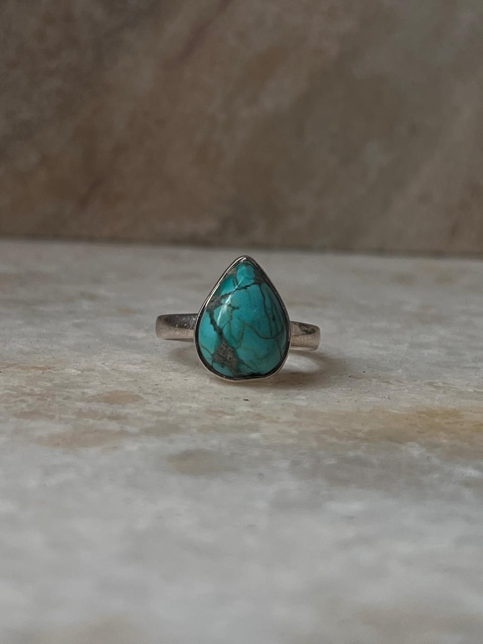 This elegant ring features a beautiful Tibet Turquoise Pear stone set in a silver band.