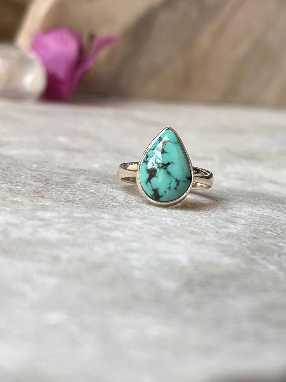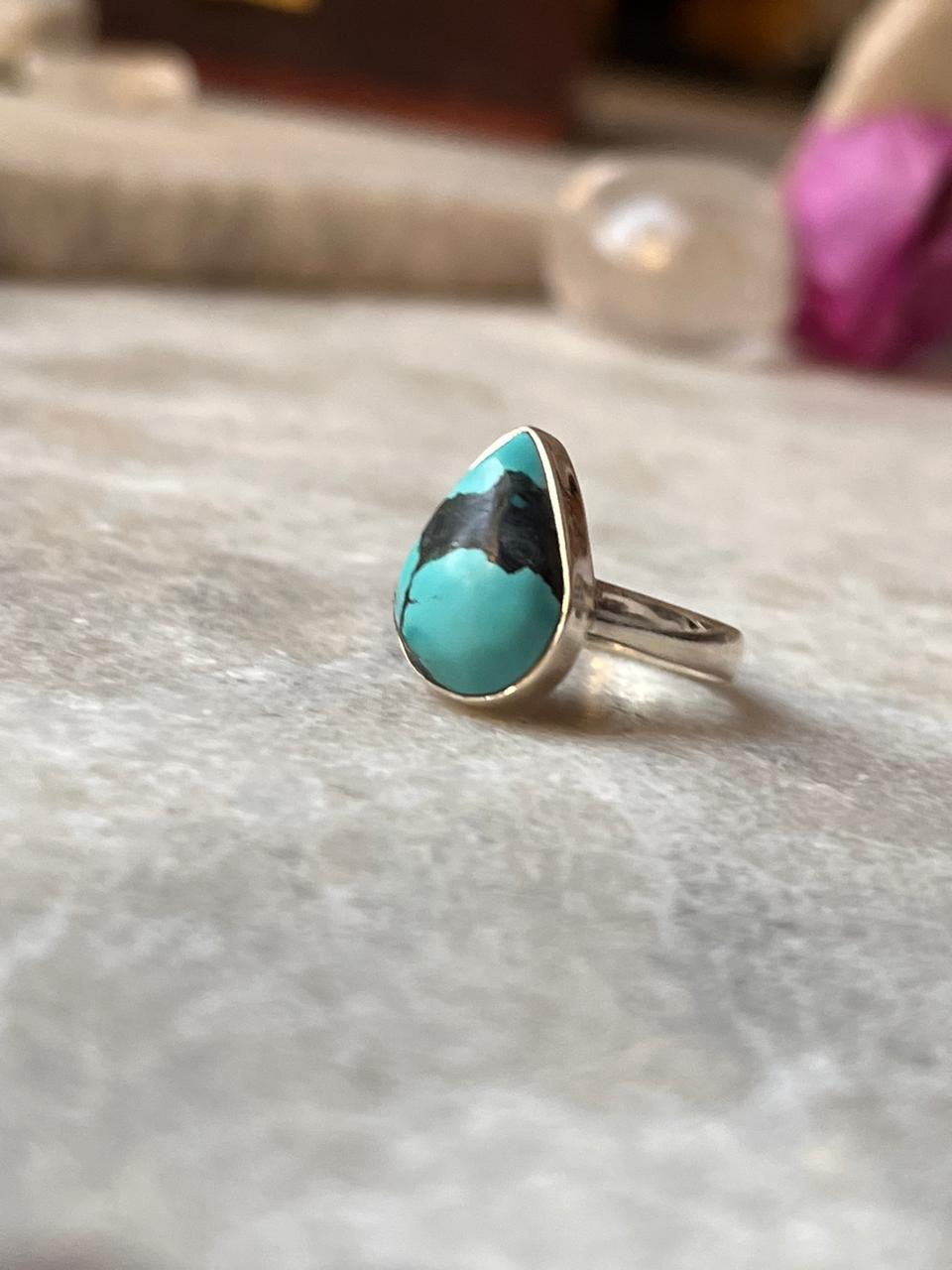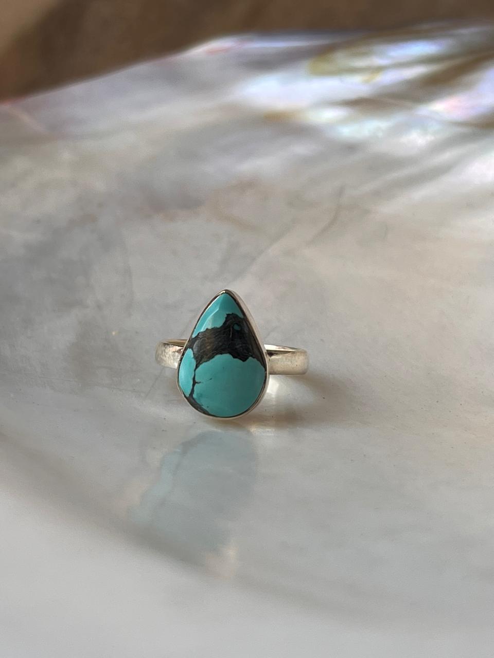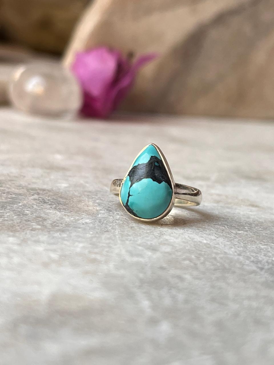 This elegant ring features a beautiful Tibet Turquoise Pear stone set in a silver band.