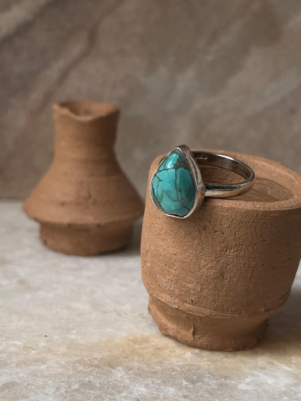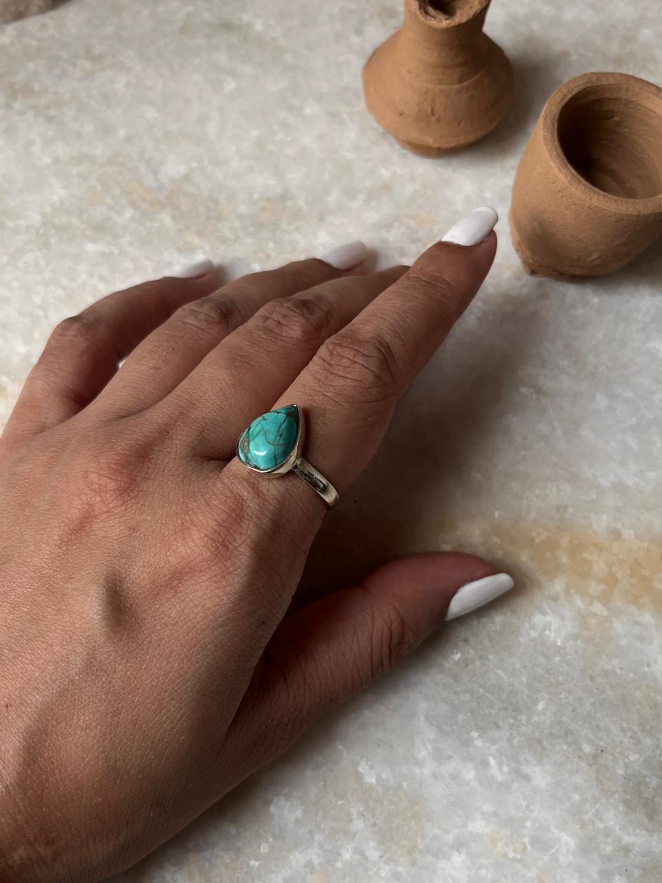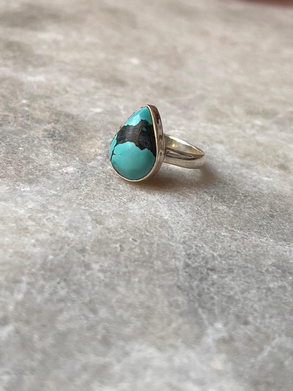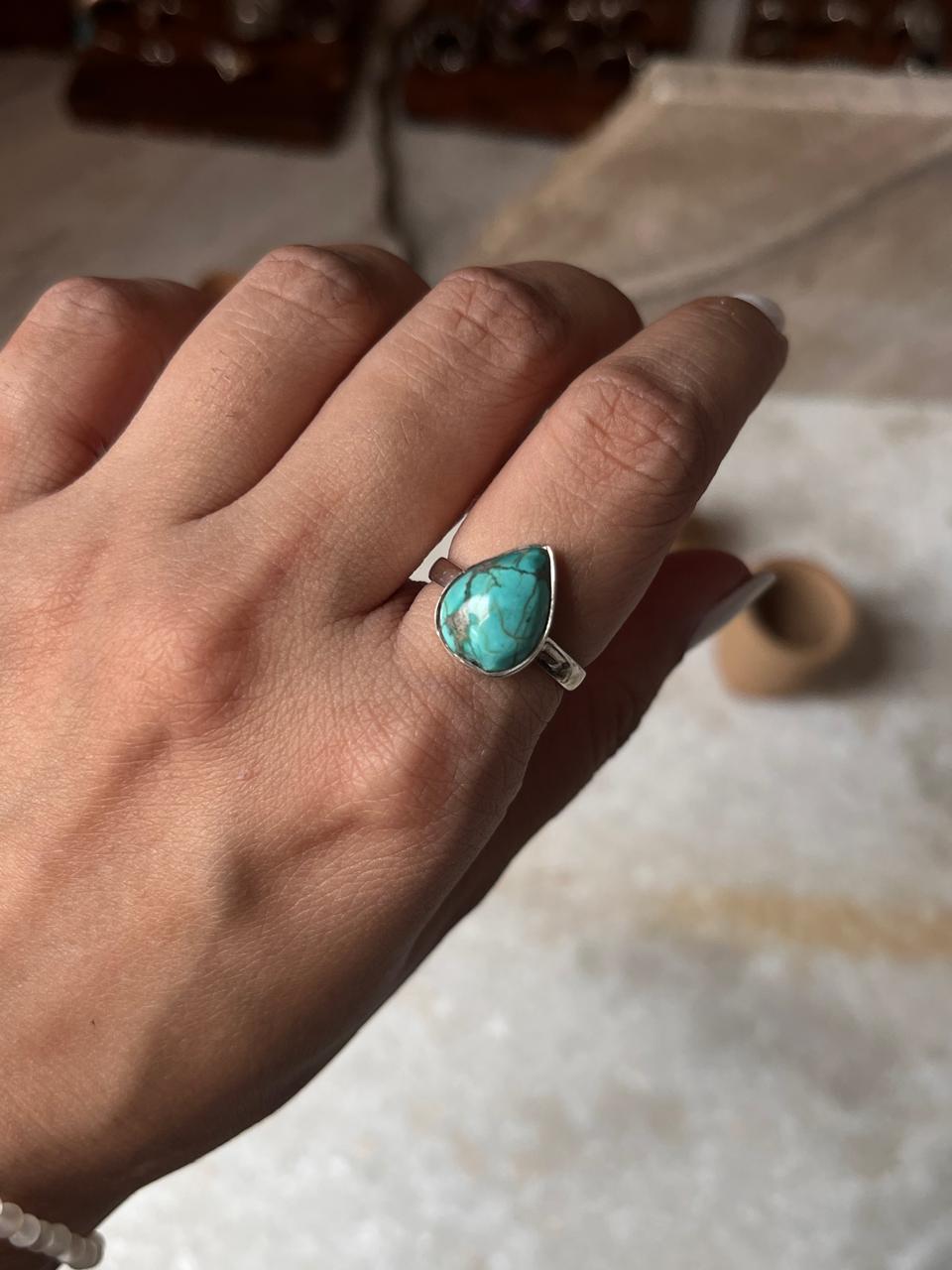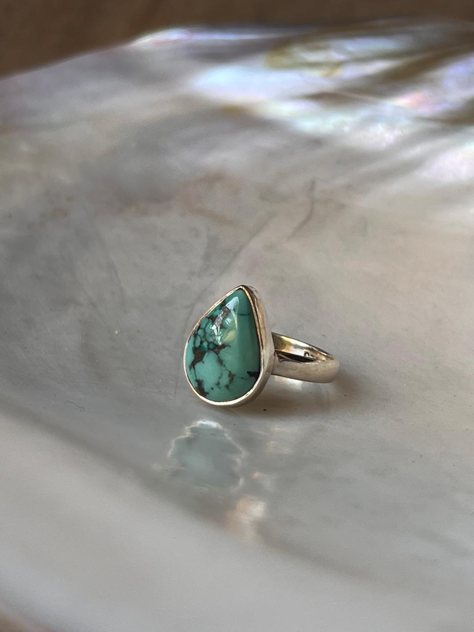 This elegant ring features a beautiful Tibet Turquoise Pear stone set in a silver band.