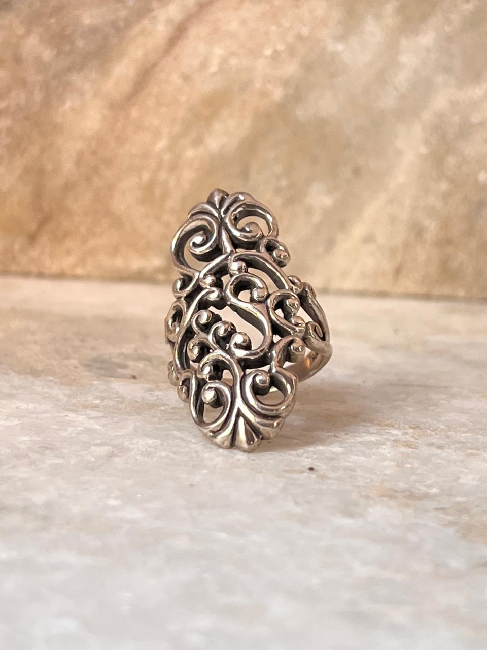 "A stunning vintage Fleur de Lis statement ring, showcasing the iconic symbol of royalty and elegance. This bold piece combines intricate craftsmanship with timeless sophistication, perfect for adding a regal touch to any look."