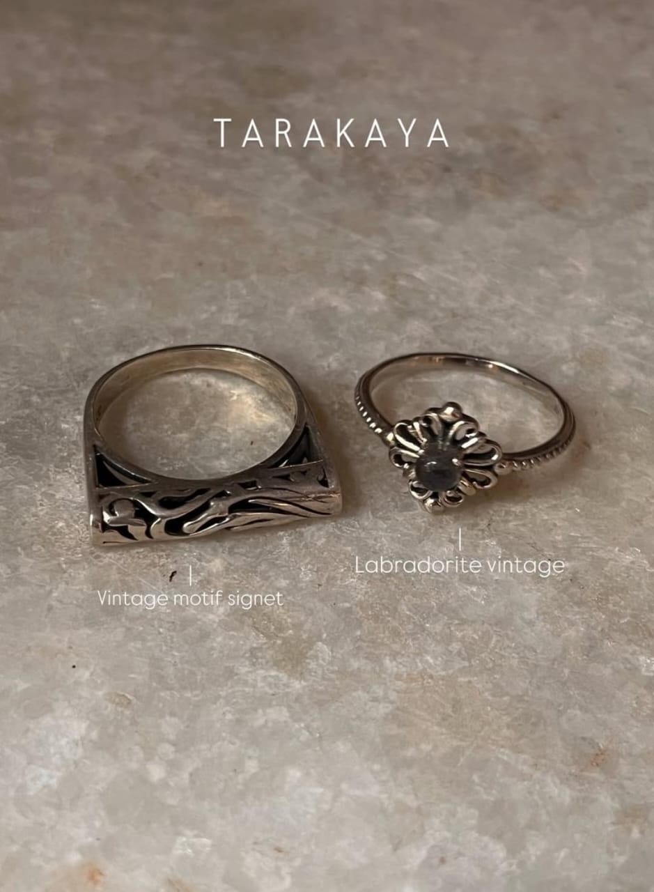 Vintage Motif Fleur Labradorite & Vintage Motif Signet 925 Sterling Silver Stack Set Ring