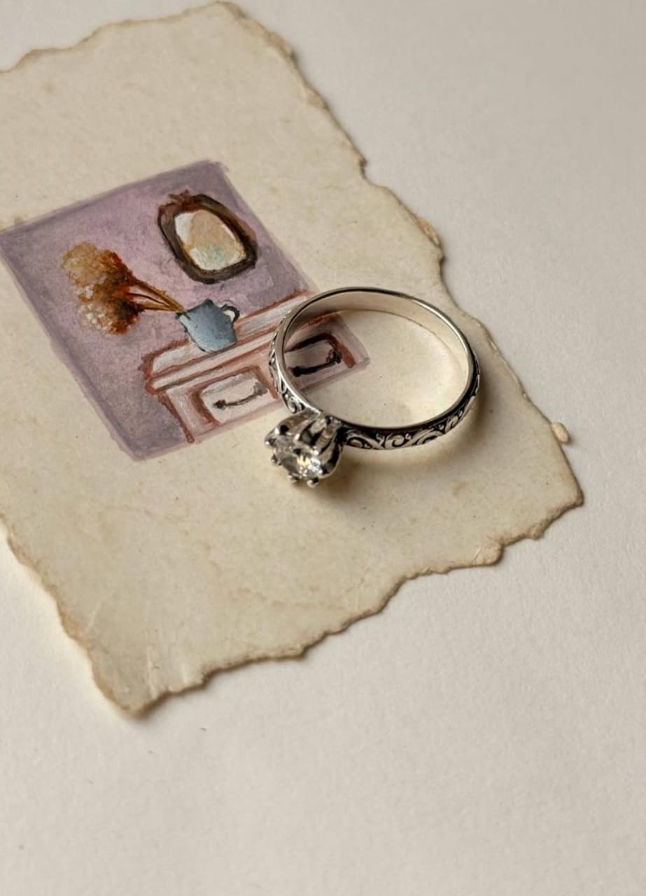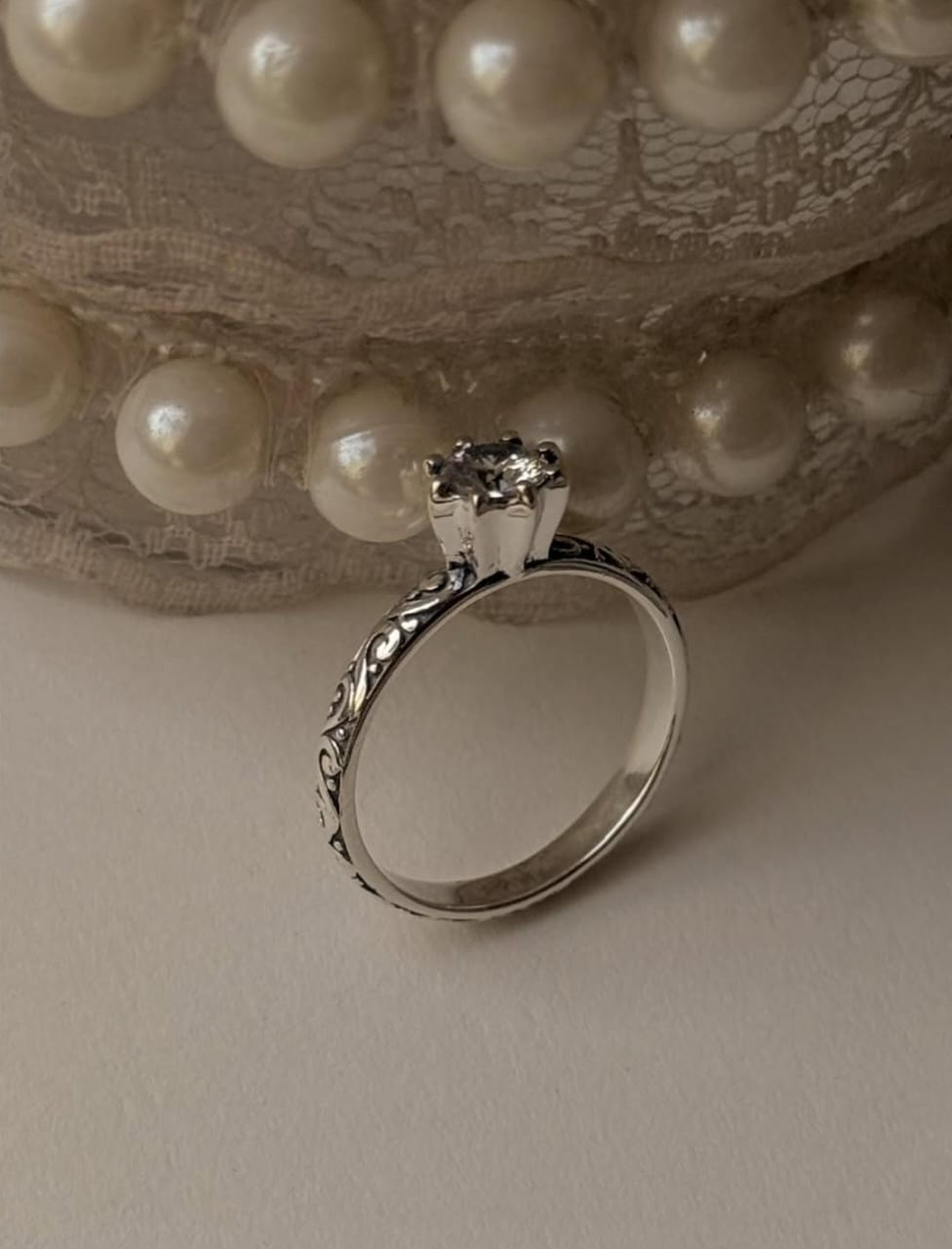 This elegant ring combines vintage-inspired motifs with modern design, featuring a central cubic zirconia (CZ) stone set in solid 925 sterling silver. Its intricate detailing and stackable band make it a versatile piece suitable for various occasions.
